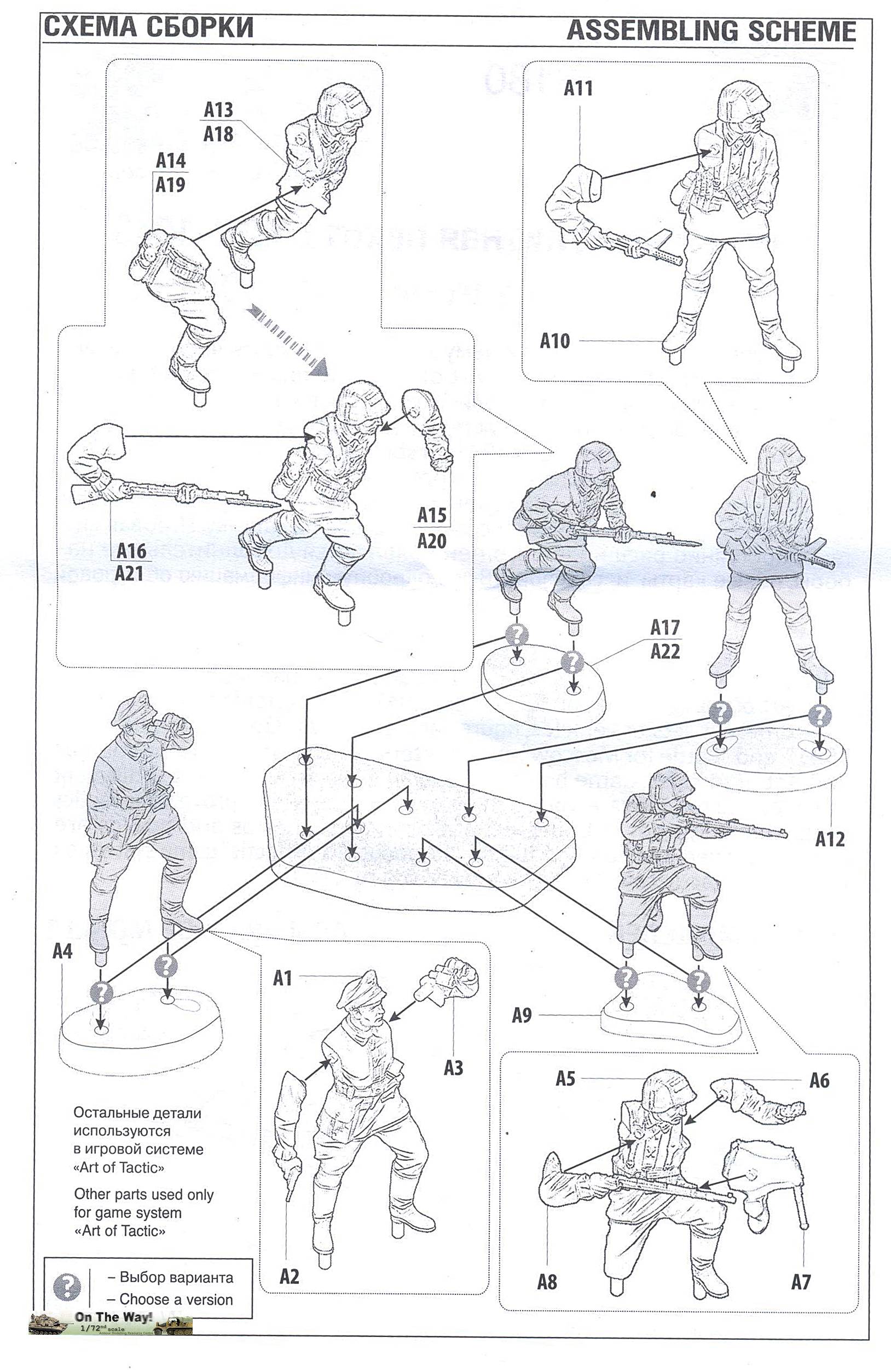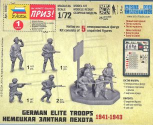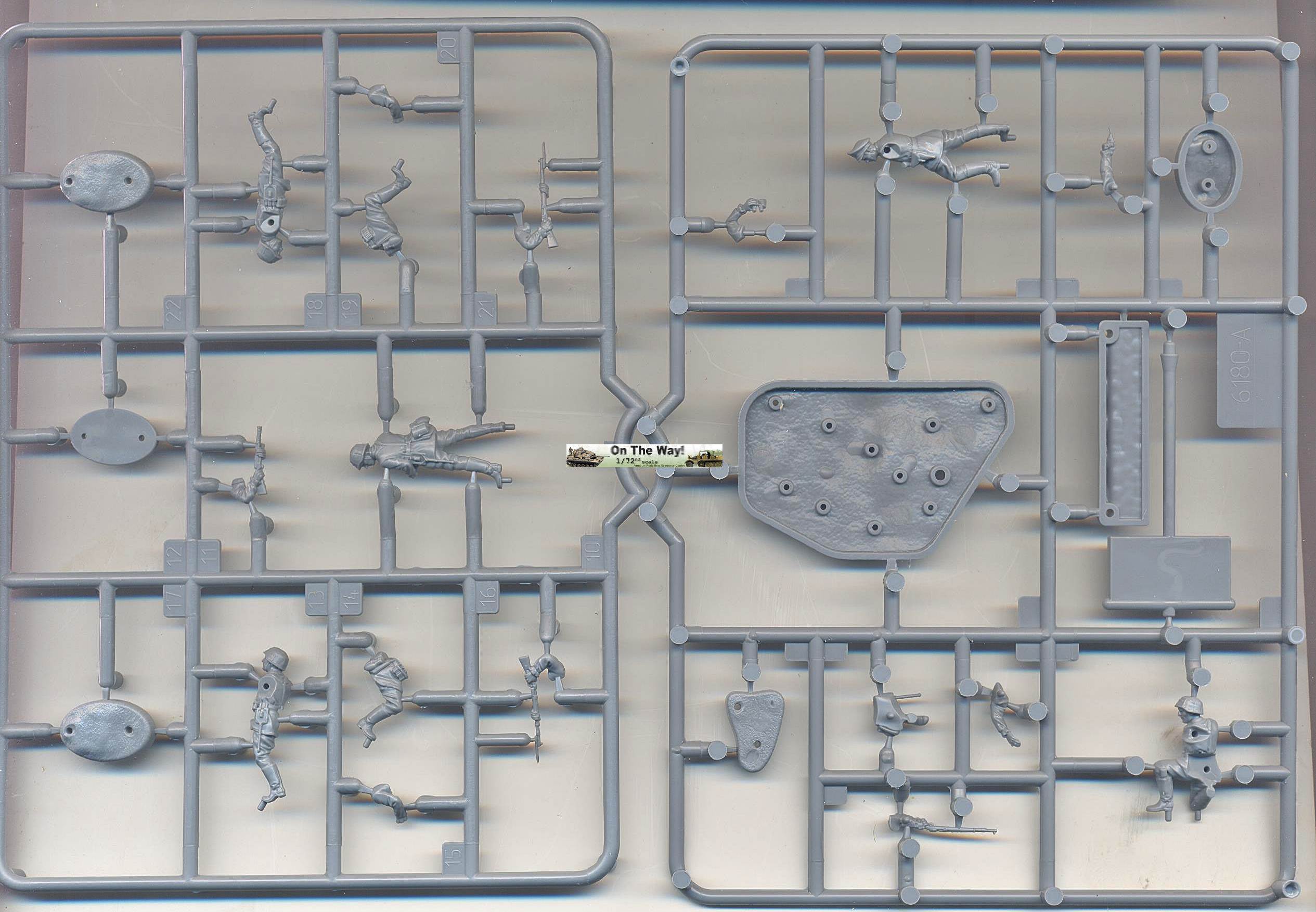 underneath. The figures have convincing poses, but are somewhat incongruous, as already mentioned. All are travelling with limited gear and are not even wearing the gas mask canister. The figures appear to wear the taller boots, which are an indication of an early war setting again. Three of the figures are armed with the standard Kar98k rifle, of which two are running (with bayonet fixed to the rifle); one is firing while crouching; one is cautiously observing, holding (what seems to be) an MP28/2, which is a very rare piece of equipment (even more so in 1/72) and would not be used long after the start of Barbarossa. The last one is observing the surroundings with his binoculars, pistol at hand. He is most likely a senior NCO, based on the battered-looking Schirmmütze that he is wearing. Obviously, these sets are aimed at the wargaming community (with a stats card -not shown-, flag and base) and while this might drive up the cost due to extra parts not needed for static modeling, it also reduces the cost due to a larger sales potential. Besides, I actually like the bases as they are very practical for handling the figures during painting, while the flag is a good source for thick plastic when scratchbuilding. Casting and detail is really good, except at the level where the two mold halves meet. In this area some resculpting will be necessary. The joints between the parts will also need a bit of attention, but as the plastic react well to MEK, they can easily be smoothed out. As far