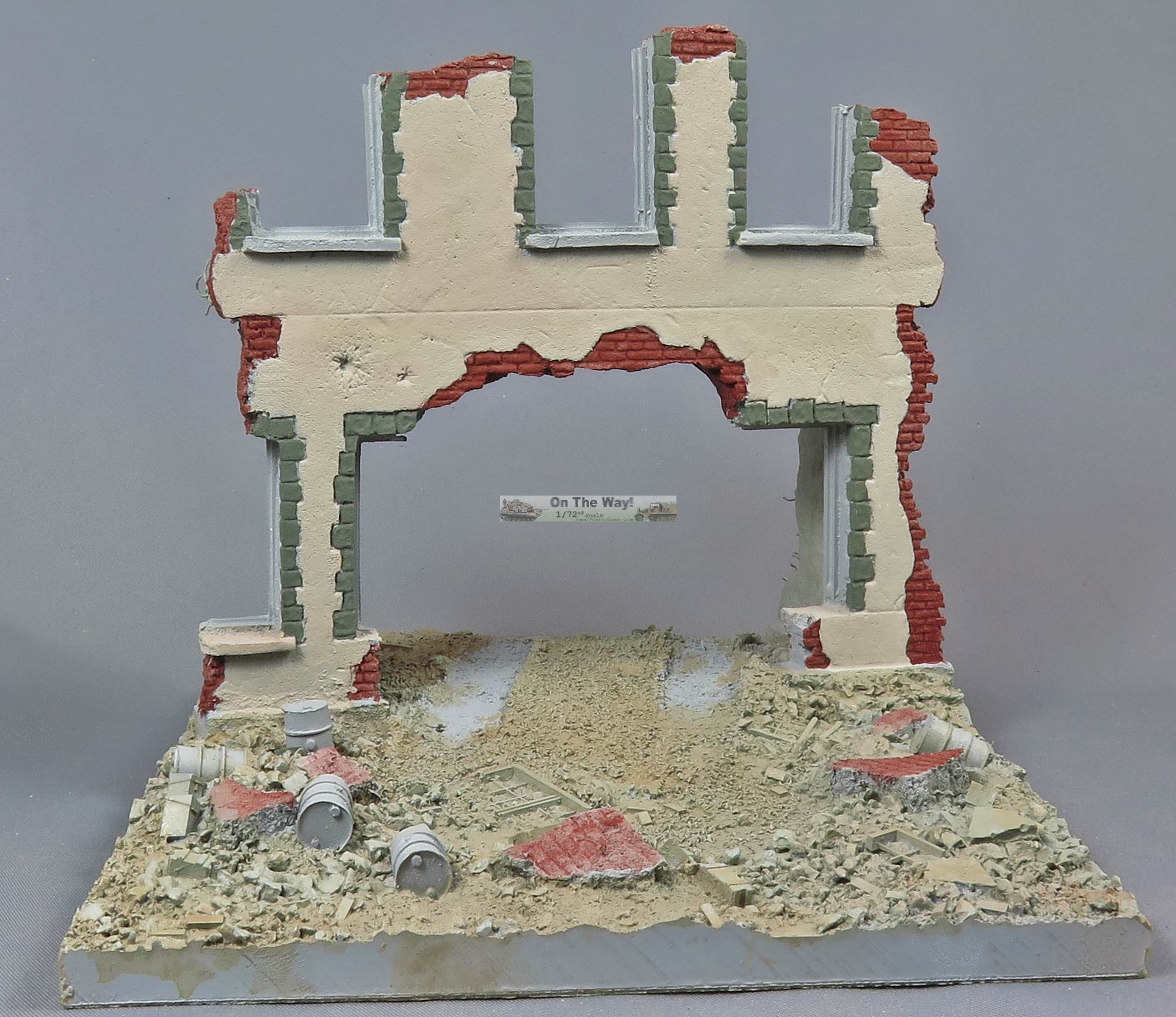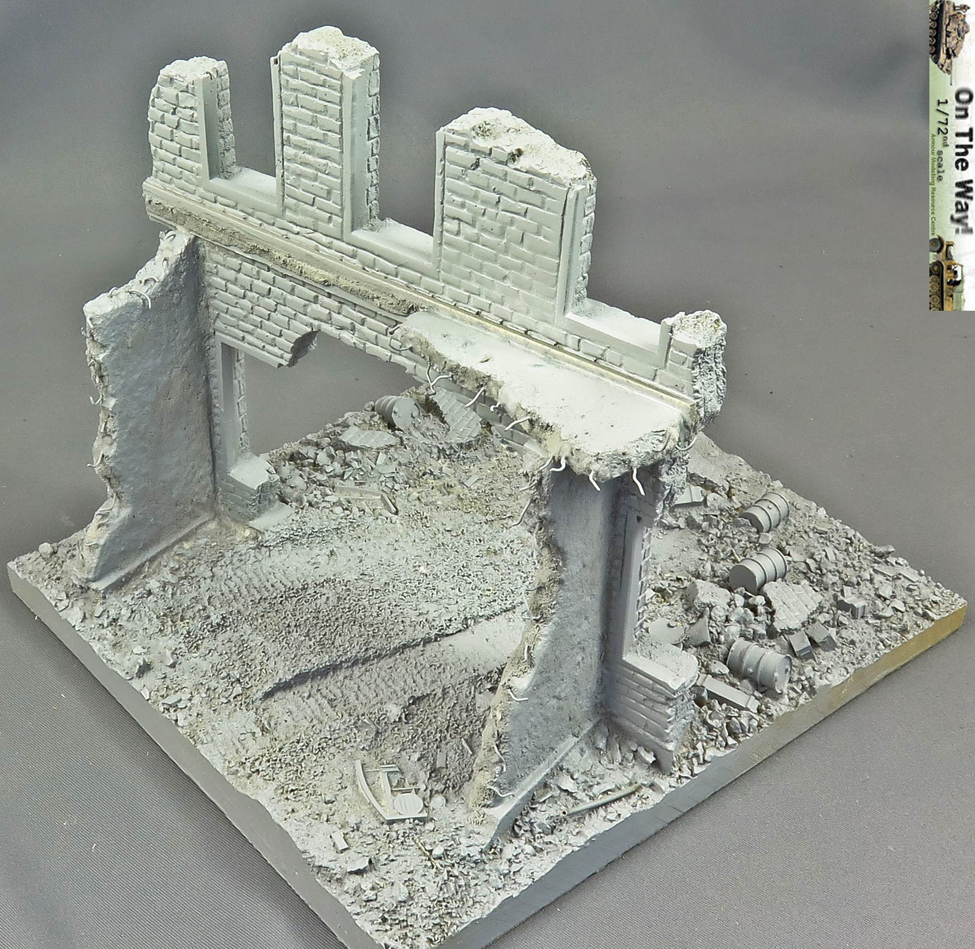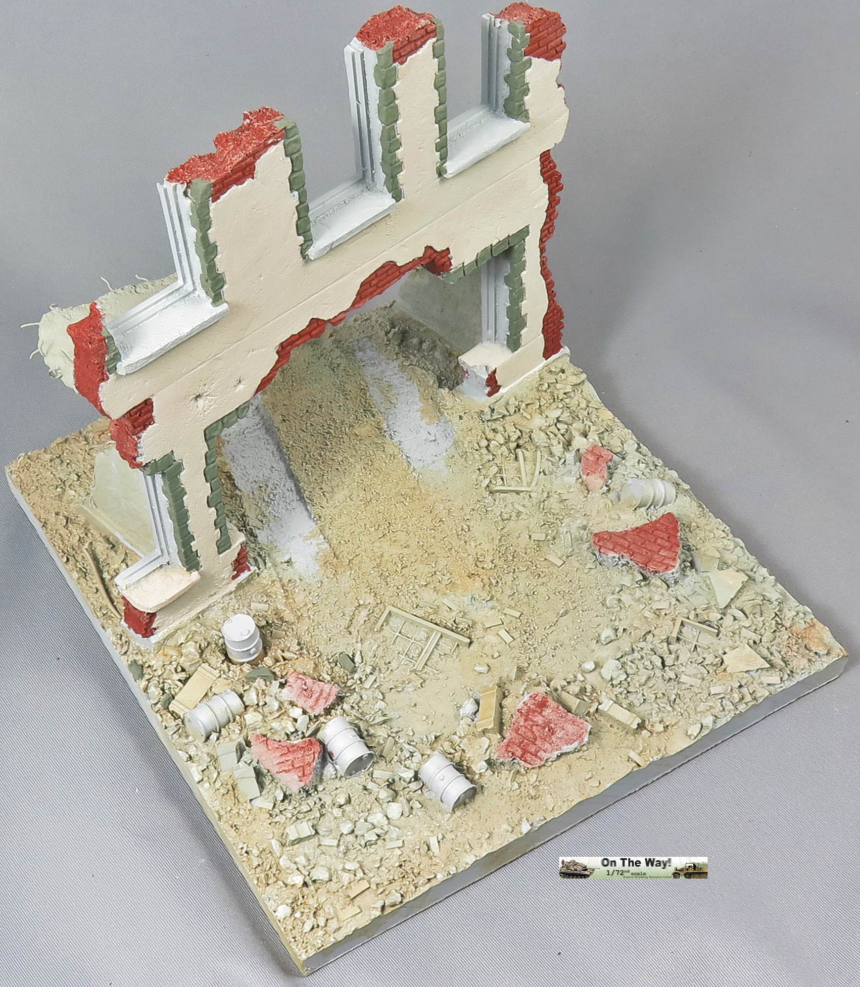Assembly was straightforward, but as already anticipated, adding detail to the rear of the parts took a huge amount of time. In my opinion it is absolutely necessary, however, as both sides of the parts are visible. As you can see in the pictures below, on some parts the bricks and window frames were engraved, while other parts were roughened up with super glue and baking powder. Rebars made from copper wire were added as well. In the pictures below a very basic paintjob was applied, which clearly still needs a lot of work. A lot of extra rubble will be needed as well.