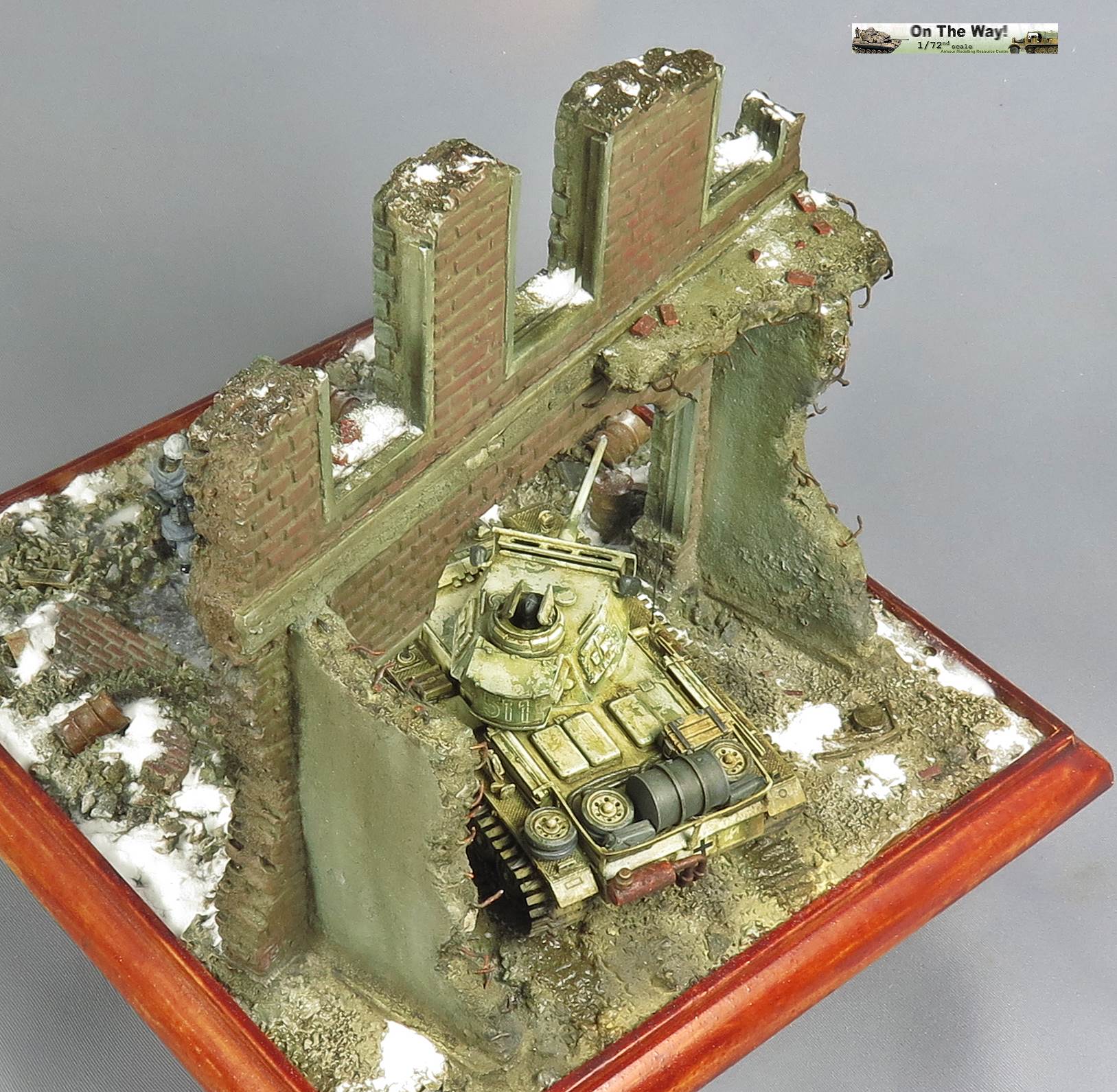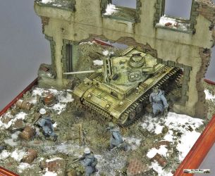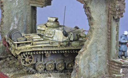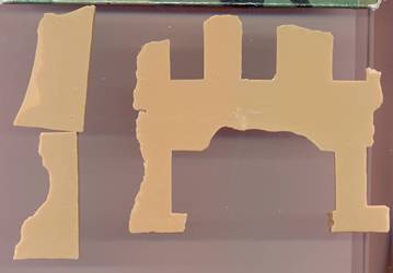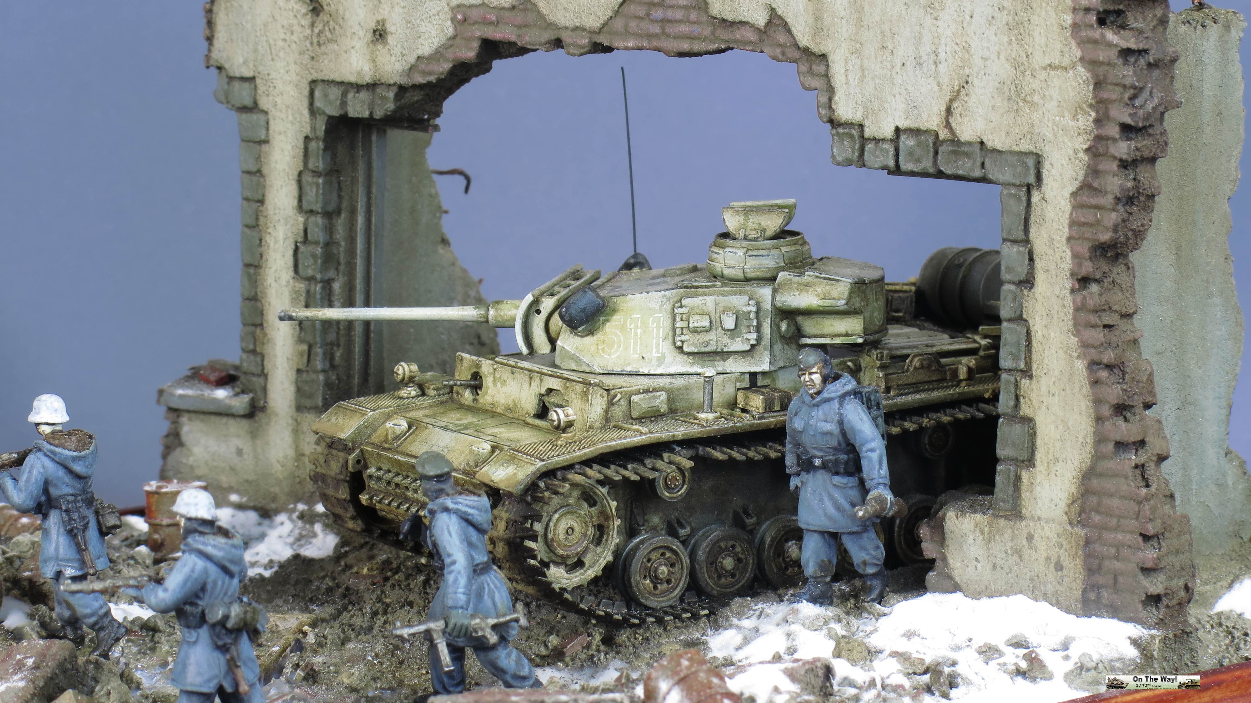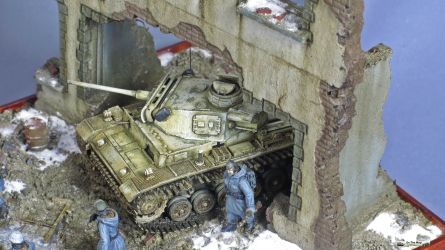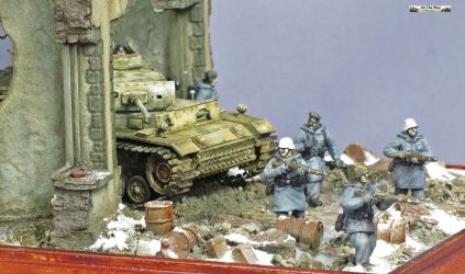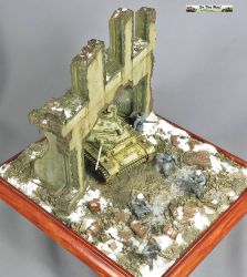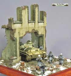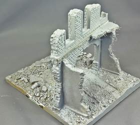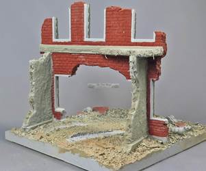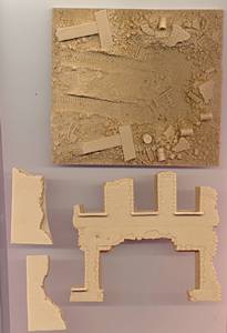 Assembly was straightforward, but as already anticipated, adding detail to the rear of the parts took a huge amount of time. In my opinion it is absolutely necessary, however, as both sides of the parts are visible. As you can see in the pictures below, on some parts the bricks and window frames were engraved, while other parts were roughened up with super glue and baking powder. Rebars made from copper wire were added as well. In the pictures below a very basic paintjob was applied, which clearly still needs a lot of work. A lot of extra rubble will be needed as well.