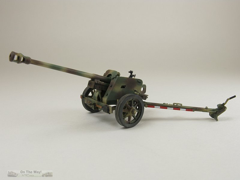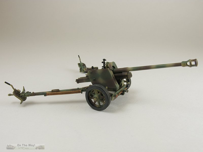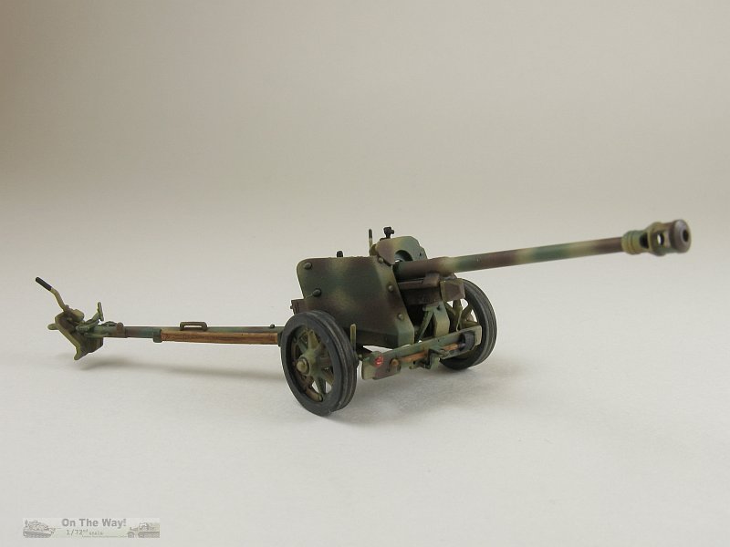 The majority of the work revolved around shield changes. The most noticeable being the fillet extensions above the barrel slot. After a few attempts I was able to cut some presentable fillets from some thin plastic sheet. These I sanded down to make them as thin as I possibly dared to go. The slot in the shield has to modified so that its sides are straight. This I did by cutting away all of the plastic save for the support brace that spans the gap at the top. I left this in place for a modicum of stability and strength for the shield while I worked on it. I attached the shield to its mount and let everything dry solid. Then I carefully snipped off the small brace that I left in place earlier, sanded everything smooth and added my new fillets. There are a pair of support braces welded to backside of the front fillet which I added with small strips of plastic. Other minor changes involved relocating the box on the backside of the rear shield from the centre, to the right side. A new gun sight was obtained from my spares box. As I had done for my previous Pak 40 build, I replaced the kit's barrel with an excellent metal item from RB Model, and as happened with the Pak 40, the metal barrel makes the model nose heavy, forcing me to display the gun with a small piece of blue tack under one of the spades to keep it sitting on its trails. That's about it as far as the conversion goes. Nothing really difficult, other than cutting out the slot in the shield, making the new fillet extensions and tow hitch, along with the usual test fitting along the way to ensure everything fits properly, are the only things to slow you down versus building the kit straight from the box. References
