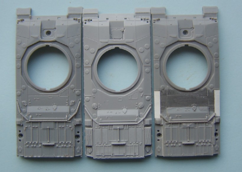 The Jerry can holder, as can be seen both a similar and both have jerry cans moulded in place, if I had to choose between them I would pick the Trumpeter, although for the first aid kit and telephone the Dragon one is better. The exhaust shrouds, the difference in length comes from the fact that the Dragon exhausts are in the wrong place, mounted too far forward on the hull due to the size of the engine deck. Both have a similar profile, but both sit slightly too high The add- on Armour, as can be seen the dust skirt on the Trumpeter kit is a separate piece, as the armour is also used for the KFOR version, to this end the frontal portion is a separate piece as the KFOR option is also different. The Wheels from left to right Trumpeter, Dragon and my favorite Revell, the Sprockets are reversed with Dragon being first The Turret With the Hull done the Attention turns to the Turret, at a quick glance the Trumpeter looks to be great, the gun sight is the correct shape and length, the sight mounted just to the left of the main sight has better relief than the Dragon kit and the loaders periscope is also better but if you look at the front plates of the turret you can see that the Trumpeter ones are noticeably bigger than the Dragon plates, the Dragon ones are correct. Turning the Turret on to it's side it becomes noticeable as to why the front plates on the Trumpeter turret are bigger, the Turret is squashed for want of a better phrase, the Dragon turret roof has the correct height, the Trumpeter side wall profile is correct at the rear with the stowage bin running parallel to the hull and not angled downwards as in the Dragon kit. the front portion of the Dragon kit has the correct profile for the Challenger with the Trumpeter one being incorrect in this area.The Trumpeter turret although correct in profile is slightly too long making the rear longer than it should be The Commanders hatch, although the Trumpeter hatch is moulded closed, the hatch is the better with the two round housings at the rear being the correct size compared to the oversized Dragon ones, here the best thing to do would be to remove the moulded in Trumpeter hatch and replace it with the Dragon hatch. The Loaders hatches, here Trumpeter have the correct hinge sizes, but the hatch is the wrong shape, the Dragon hatch is the correct shape but the hinges are wrong, the other hatch is the other type supplied in the Dragon kit The Gun Barrels are very similar, but the Dragon barrel needs to be turned 1/4 turn to line up the thermal sleeve, to explain this better the indentations on the Thermal sleeve should be in two groups of 3 with a larger gap between the two groups, the groups should be aligned top and bottom with the wider gap running down each side, on the dragon kit this gap runs along the top of the gun, on the Trumpeter kit it seems to need a 1/8 of a turn to line the gaps up correctly The gun mantlet and TOGS housing, this is the easy bit with the Trumpeter one having the correct shape size and profile and can be used directly as it is. The GPMG, here Dragon have the better rear ends with Trumpeter the better front ! just to be awkward, that being said the Dragon ones are very thin and to my eye too thin The independant commanders scope, this is good fun !! not ! Dragon have the correct height and trumpeter the correct width, it is easier to change the Dragon one by adding thin plastic sheet to the outside and replacing the bolt detail the Smoke dischargers, I think that here it comes down to personal choice, I find Dragon s to be better although others might see Trumpeters as better.