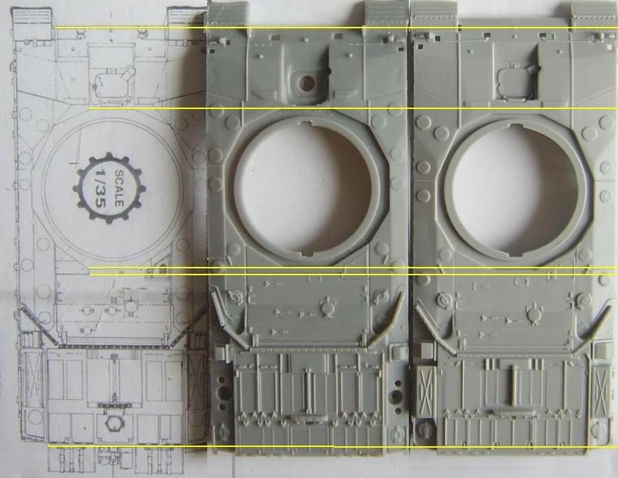With the release of the Trumpeter Challenger 2 I thought that it would be a good idea to do a comparison between the two. Both are not perfect and unfortunately there is no easy fix for either of them. I suppose that until someone releases a good Challenger 2 the only way forward is to kit bash the two, but even that is not as easy as it first seems as it is not just a simple case of swapping parts, there are still alterations that need to be done and in the end it will come down to which is the lesser of two evils or how far the individual wants to go ! there are those who moan and do all they can about a Sherman that is not correct, or about a Panther or whatever it is they like the best, for me it is Modern British and Russian vehicles that I can not accept faults on when building a kit. In the following Comparison the Darker Grey is the Dragon kit with the lighter being the Trumpeter. The Hulls I will start with the upper hull size wise they are both the same and it is just in details that they differ, but it is a big difference. I have said before that the Dragon engine deck is too long and have even shown how to correct it HERE, for some understandably this may be a bit too much work. The good news is that the Trumpeter engine deck is the right length, unfortunately the rest of the details on the Trumpeter kit are very simplified, the Dragon deck is the better detailed but needs shortening and modifying on the rear right hand corner.The exhausts on the Dragon kit are slightly too far forward, this is rectified when the kit is altered, they are also slightly too small. I have also included the hulls against the Tankette drawings, showing how the two kits are different and how the Trunmpeter turret sits too far back from the front. Here you can see the difference in length of the engine decks the hull on the right is a modified Dragon hull, Closer inspection of the front will show that the two kits differ, here again the Dragon kit is correct A comparison shot of the Trumpeter and the Modified Dragon engine decks as can be seen the alterations have corrected the length of the engine deck. The Trumpeter and an unmodified Dragon hull, it is clear from this shot just how out the Dragon rear hull is. The lower hull, the Trumpeter kit has the correct wheel spacing's. The rear Plate, both have the same moulded on details. On both kits the fuel drums and their holders are moulded as one piece, the details are correct with the Dragon ones having a bit better relief but still not enough.
