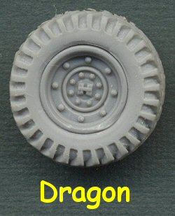 Although they are not easy to assemble, the Dragon wheels are some of the better looking wheels in this comparison. The tire is rubber, and needs to be stretched over a plastic wheel rim. This is not easy, and you can see that the rim has been slightly damaged in the process. The rubber tire tread pattern is pretty good, though with some flash needing to be trimmed, which is difficult to do without leaving little hairs behind. I suggest melting the flash off instead with a hot pin. Wheel rim detail is very good, though the overall dimensions are not accurate (tire is too small and rim is too large).