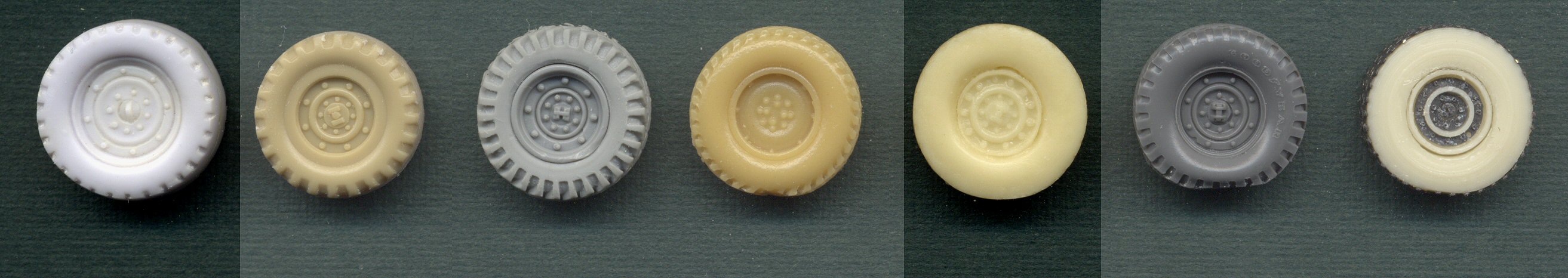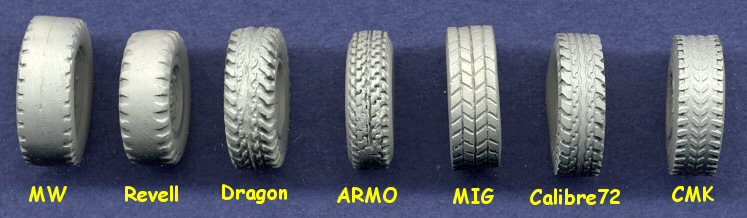 wheel. This past year, both Revell and Dragon released plastic kits of the ubiquitous HMMWV utility truck, and they were immediately followed by two sets of resin replacement wheels, one from MIG Productions and the other from the relatively new Calibre72. I have often seen questions on the forums of which were the better wheels, and when I sat down to compare them all, I remembered that these four were not the only Humvee wheels out there. The very first Humvee kits released were a series of resin kits from ARMO. Although they are older models (I think released in 2000 or 2001), they are also quite fine, and are superior to any other Humvee on the market when it comes to interior detail, including complete engines. A few years ago, Military Wheels (MW) released their own series of Humvees, the first time that they were made in plastic. Granted, they are limited-run plastic, which means that they will require a little extra work to clean up and assemble, but I'm building one right now and it's really not a bad kit (well, except for the wheels, as you will see). So, we have four companies producing Humvee kits: ARMO (several versions in resin), MW (several versions in limited-run plastic), Revell (two versions in plastic), and Dragon (many versions in plastic). We have two resin manufacturers selling replacement wheels: MIG and Calibre72, and we also have a resin and etched metal conversion set from CMK that includes replacement wheels. This gives us a total of seven wheels to compare. I've arranged the wheels in the scan with the three plastic wheels on the left and the four resin wheels on the right. I should have placed the MIG and CMK wheels adjacent to each other, since they both represent the new "aggressive" style of wheel, but I didn't think of that until now. All other wheels have the original tread pattern. MW and Revell are both plastic wheels, while the Dragon wheel is a rubber tire stretched over a plastic wheel rim. ARMO, MIG and Calibre72 are one-piece resin parts, while the CMK item has separate resin wheel and tire parts, with the tread and wheel rim details provided in etched metal. This following scan shows the same wheels after priming them all in light grey to better compare their detail: As you can see, the CMK wheel looks really bad because of superglue that I had slopped on the tire during construction, which I didn't notice until after painting it. I was thinking of going through the effort of cleaning it up, but I really don't think I'll be using these wheels anyway, so why bother?