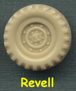The Revell wheels are far too small to use. They look like those stupid little wheels you see people mount on Honda Civics all the time. The rim detail is not too bad, as far as the bolts and hub, though as you can see, where does the rim end and the tire begin? As with the MW wheels, being injection-molded plastic, there is no tire tread pattern. Too bad they didn't mold these wheels in three parts as they did for their Luchs and Fuchs kits.