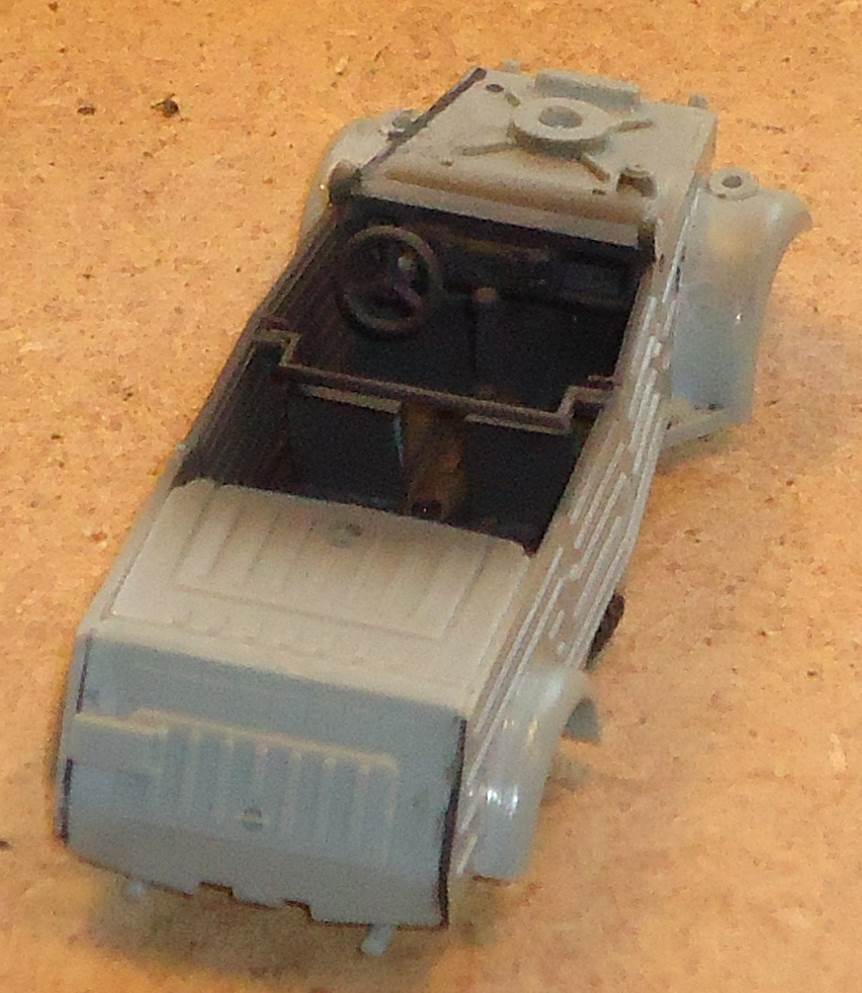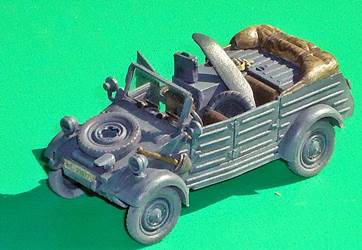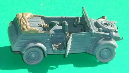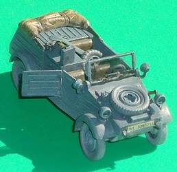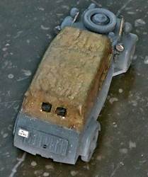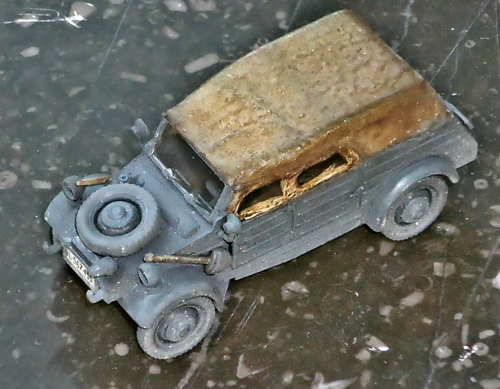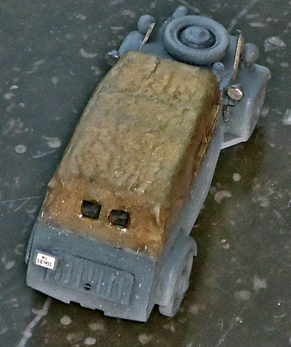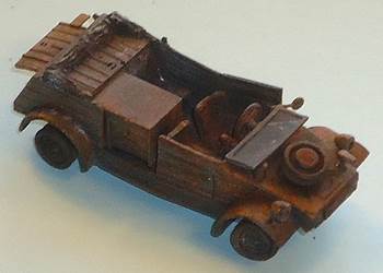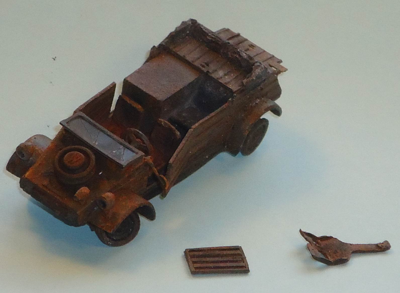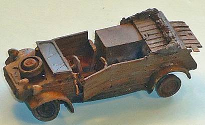 got wrong. The parts are very fine (the walls of the hull are much thinner than the available plastic kits) and with nice and abundant detail. Unfortunately warping and pinholes are present, while the ribs on one of the doors doesn't line up with the rest. While this can be taken care of with a certain amount of TLC, what finally made me relegate the kit to the status of shelf queen, was the roughness of some of the parts, which became blatantly apparent after priming. Sanding is an option, but with the corrugated nature of the walls of the hull and around some of the finer details, I felt unworthy of the task at hand. Some time after having promoted the kit to shelf-queen status I was in need of a wrecked vehicle to fill a void in a diorama. Given the roughness of the kit, I felt that it would be a good basis for a burnt-out vehicle. A couple of bullet holes were added, a fender bent and the upholstery of the front seat replaced by springs made from copper rod. Wheels from an Academy Kübelwagen (which are too small) were sanded down to serve as burnt-out hubs.