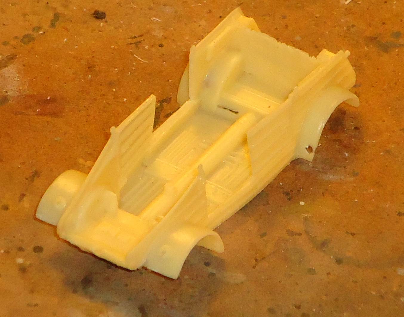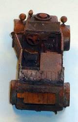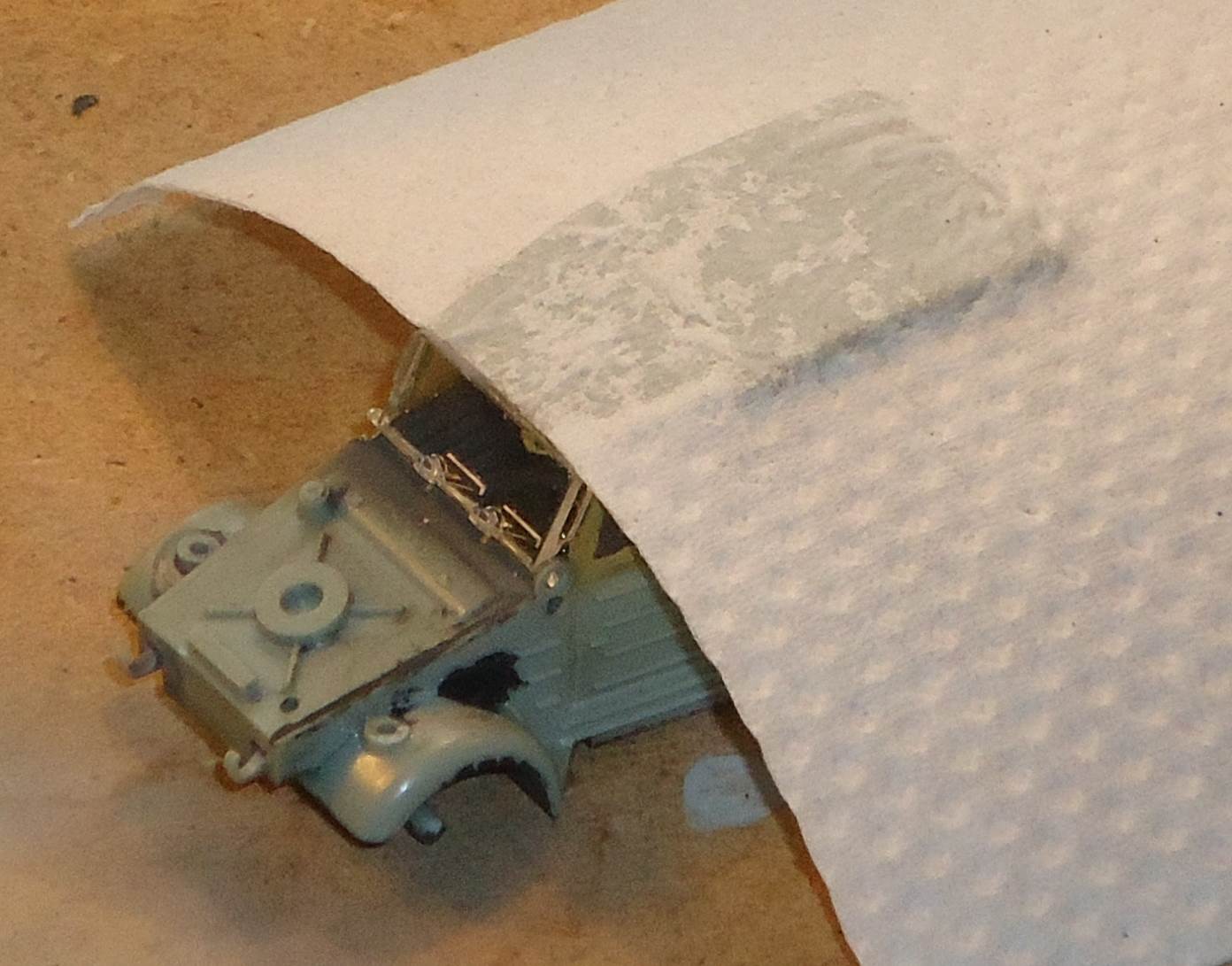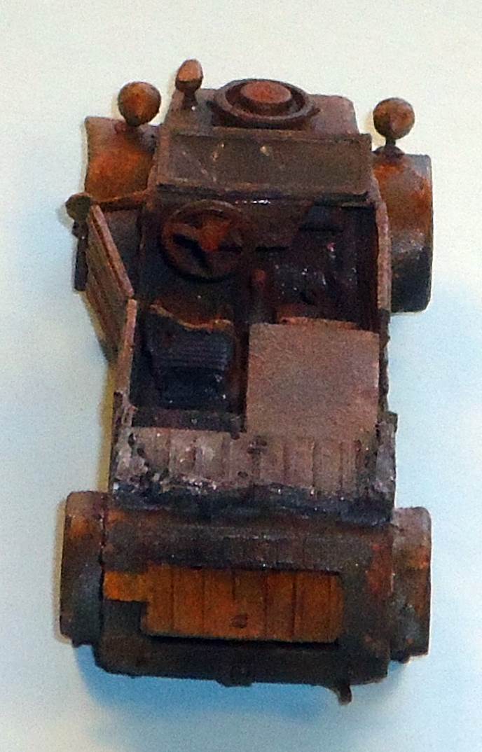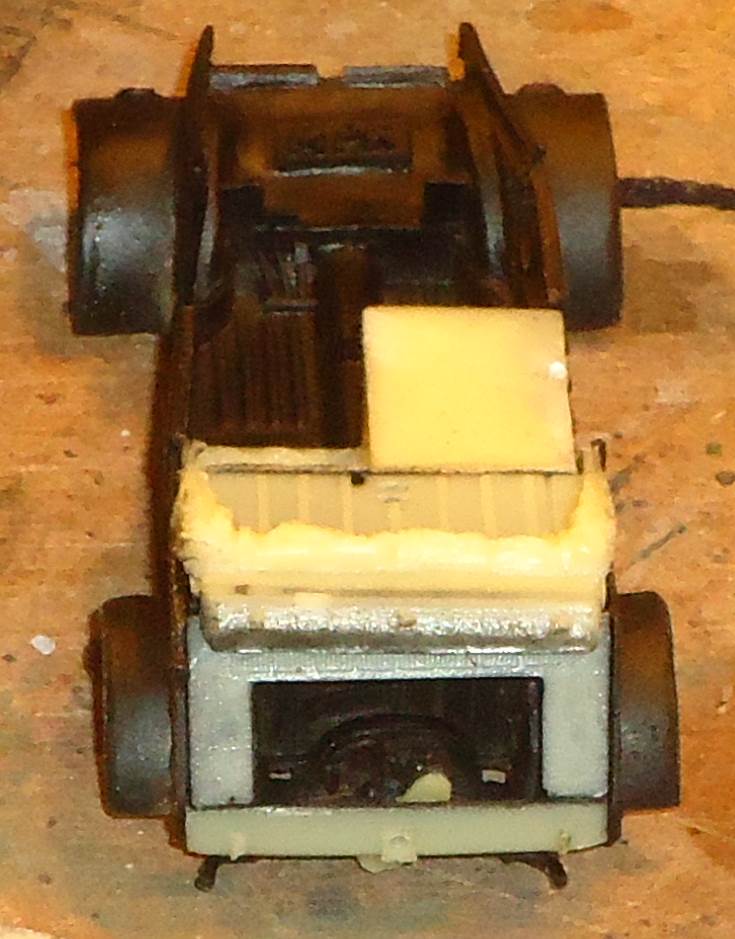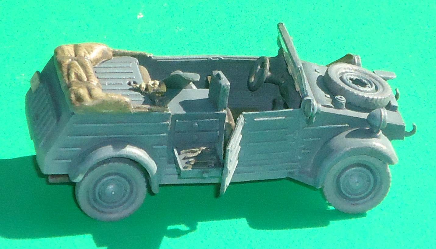 got wrong. The parts are very fine (the walls of the hull are much thinner than the available plastic kits) and with nice and abundant detail. Unfortunately warping and pinholes are present, while the ribs on one of the doors doesn't line up with the rest. While this can be taken care of with a certain amount of TLC, what finally made me relegate the kit to the status of shelf queen, was the roughness of some of the parts, which became blatantly apparent after priming. Sanding is an option, but with the corrugated nature of the walls of the hull and around some of the finer details, I felt unworthy of the task at hand. Some time after having promoted the kit to shelf-queen status I was in need of a wrecked vehicle to fill a void in a diorama. Given the roughness of the kit, I felt that it would be a good basis for a burnt-out vehicle. A couple of bullet holes were added, a fender bent and the upholstery of the front seat replaced by springs made from copper rod. Wheels from an Academy Kübelwagen (which are too small) were sanded down to serve as burnt-out hubs.