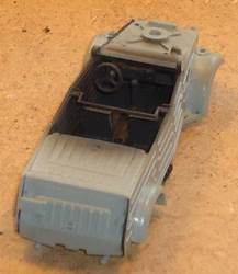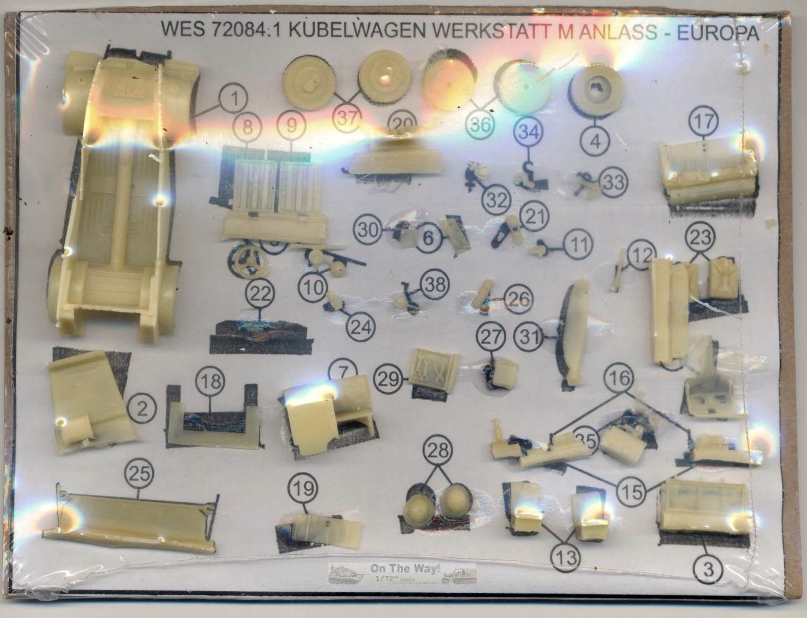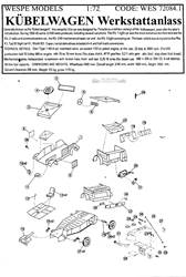 1. The Wespe kit Wespe from Romania makes this resin rendition of the ubiquitous Kübelwagen. The kit is packaged in a small cardboard box with the illustration glued to it. The one-page, one-sided instruction sheet is shown on the right. It is hand-drawn, and not always evenly copied. As this is a simple vehicle, most parts naturally go to their correct place. Unfortunately the part of the manual that is least clear is where the workshop-specific parts are installed. Fortunately the image on the boxtop can help. Here is the layout of the parts for this kit. The way the kit is packed is original: all resin parts are individual pieces (i.e. not attached to molding carrots) and glued to a paper backing with a silhouette of the part. This makes it easy to check whether all parts are there. At first I thought some parts were missing, but they had simply detached from the backing and were found in the corner of the sheet. The plastic wrapping ensures that pieces are not easily lost. A big advantage of this method (and I have no idea how Wespe does it) is that there is next to no clean-up of molding carrots to be done. While this necessary evil is mostly a wild bore in most kits, here it is limited to an occasional film that protects fragile parts (e.g. the open area in the sidewalls where the doors will come). A minor disadvantage is the need to carefully remove the glue that is used to secure the parts to the backing. A (véry