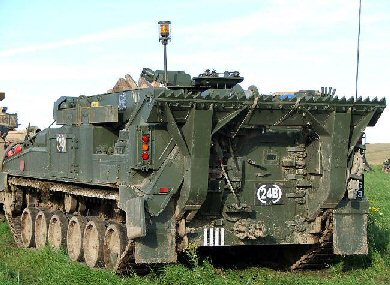 The MRV has also been seen fitted with Chobham armour panels down the sides. On the right-hand side it is the same as the infantry vehicle, which allows no access to the stowage bins behind. On the left-hand side it is the same but the panel stop at the NBC compartment to allow access to the crane. Bar armour is also fitted, but has a slightly different arrangement near the crane allowing access to the controls. No bar armour is fitted to the rear. The vehicles mount the same frontal armour as the infantry vehicle with the A frame being mounted on the front of the armour.