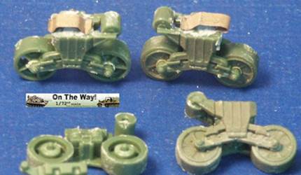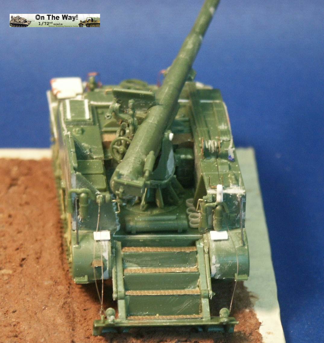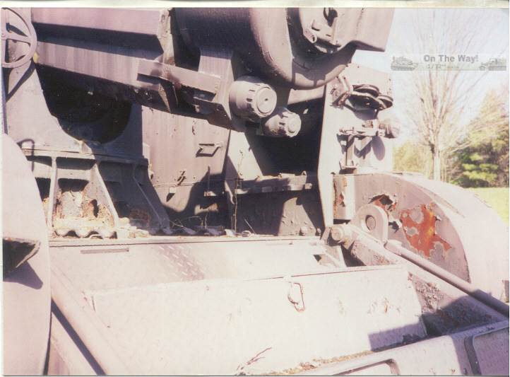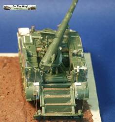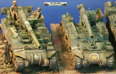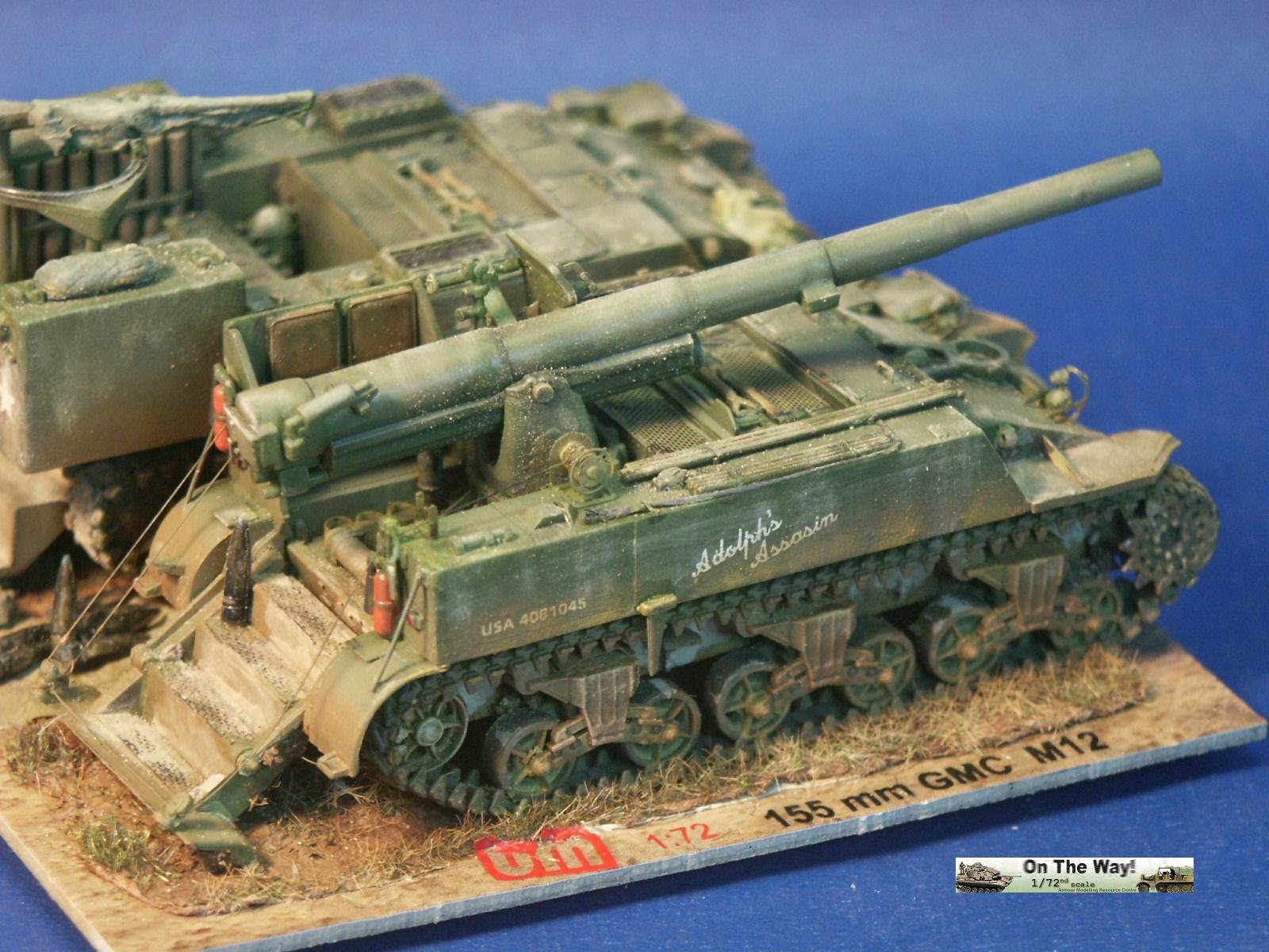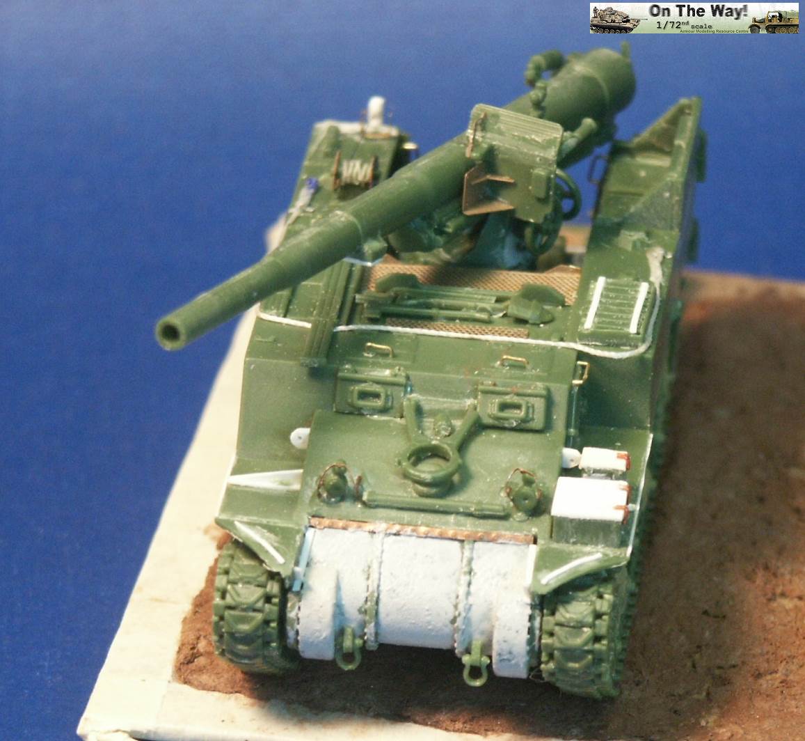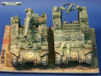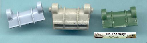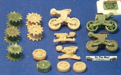 for me I finally heard from another modeler who had the same problem. The UM lower hull for their M12 and M30 assembles in a similar way to their M4 Sherman model kits. Notice that at the very rear of the gun compartment floor (part 10C) I had to fit in a fillet of white plastic to fill in a gap. The UM M12 kit 211 upper superstructure has fewer parts for the main superstructure than the ESCI M12 model but has considerably more parts for the interior and for the tools and gun. Notice the gray model putty to blend in the seam for the parts 33C and 12H. Notice that the gun has a white scratchbuilt replacement brace for a gun pedestal part (part 29H) that I lost. In the forward area of the gun compartment we can see one of the square air cleaners for the engine. The UM M30 kit comes with round, cylindrical air cleaners; I think it was a nice attention to detail to not just give the two kits the same air cleaners. The M30 and M12 were based on essentially the same hull, but in historical photos I have seen many little variations in the wheels and fittings. The gun shield (parts 24C) for UM's M1917 gun appears much more accurate than the ESCI part 16 and is enhanced by nice etched brass parts. The grouser box (parts 3H) has been given two strips of styrene to simulate the braces to hold the grousers in. The UM M12 model features a well rendered gun sight that is not supplied in the ESCI M12 model. The details on the UM 155-mm gun compare well to my reference photos, so I used it to help correct the details of the ESCI gun. An easier way to get a better gun for a great display model is to use the M1917 155-mm gun from one of the RPM GPF gun kits (see this review). The rear spade for the M12 is assembled except for the etched brass tread plates. Notice the scratchbuilt brace on the forward mudguard (fenders). Both mudguards on each M12 and M30 will need these braces. With the upper hull largely molded as one piece, the UM kit is missing the line of rivets along the upper edge that is present on the ESCI M12 model. Looking where the upper hull meets the final drive assembly I am unhappy about the fit; despite sanding and some trimming the upper hull sits too high, or the final drive assembly sits too low. A comparison of the UM wheels with the ESCI wheels shows the greater number of parts used in the UM suspension and the overall better rendered detail of the UM parts. To be fully frank, the UM suspension, though better than the ESCI parts, are still not as well done as the Dragon and Heller Sherman VVSS bogies and wheels. These are the same suspension parts as included in the UM and the ESCI M4 Sherman Medium Tank kits. Above and below are photos of the VVSS bogie assemblies used for my M12 and M30 models. To add some variation the two vehicles were given different wheels. Closure views of the UM bogies in various stages of assembly and different roadwheels, and variations in the track skid. The underside of the hull is the same as in UM's M4 Sherman model kits. Without having seen the underside of an M13 GMC, I surmise that this underside is incorrect as I suspect the engine plates should be in the hull center since this is a mid-engine vehicle. Compared to the 1/72 scale UM M30 kit built in conjunction with this M12 model, with the M12 I opted for an early variant with the open spoke roadwheels and idler wheels and early style track skids. The front mudguards have been given a scratchbuilt brace on both sides, the storage boxes have been given new lids, and the grouser box has been given two braces on top. The light gray model putty filler is obvious where part seams needing filling. At this point we have skipped ahead: what is new is the strip of plastic at the front, simulating the strip of sheet metal for hanging the side sand skirts, like those seen on the Sherman tank. The strips had a horizontal line of bolt holes. In historical photos I have never seen the side skirts actually fitted to an M12 or M30. A Heller kit open spoke idler wheel (the pale gray wheel at the rear) has been substituted for the UM idler wheel (part 3A). On top of the superstructure is a tow cable made from string and mounted to the deck. Neither the UM M12 nor M30 include the towing cable. The