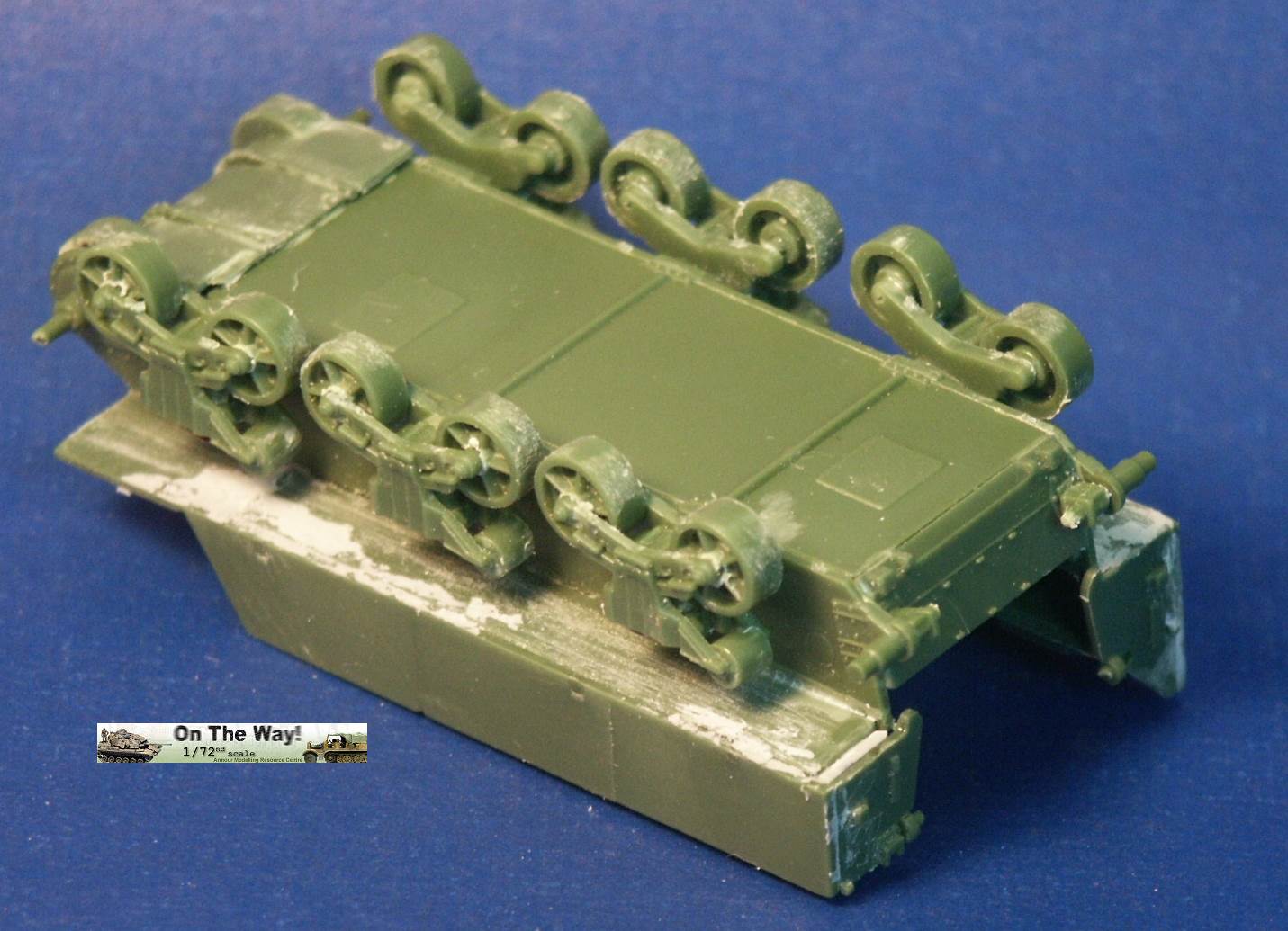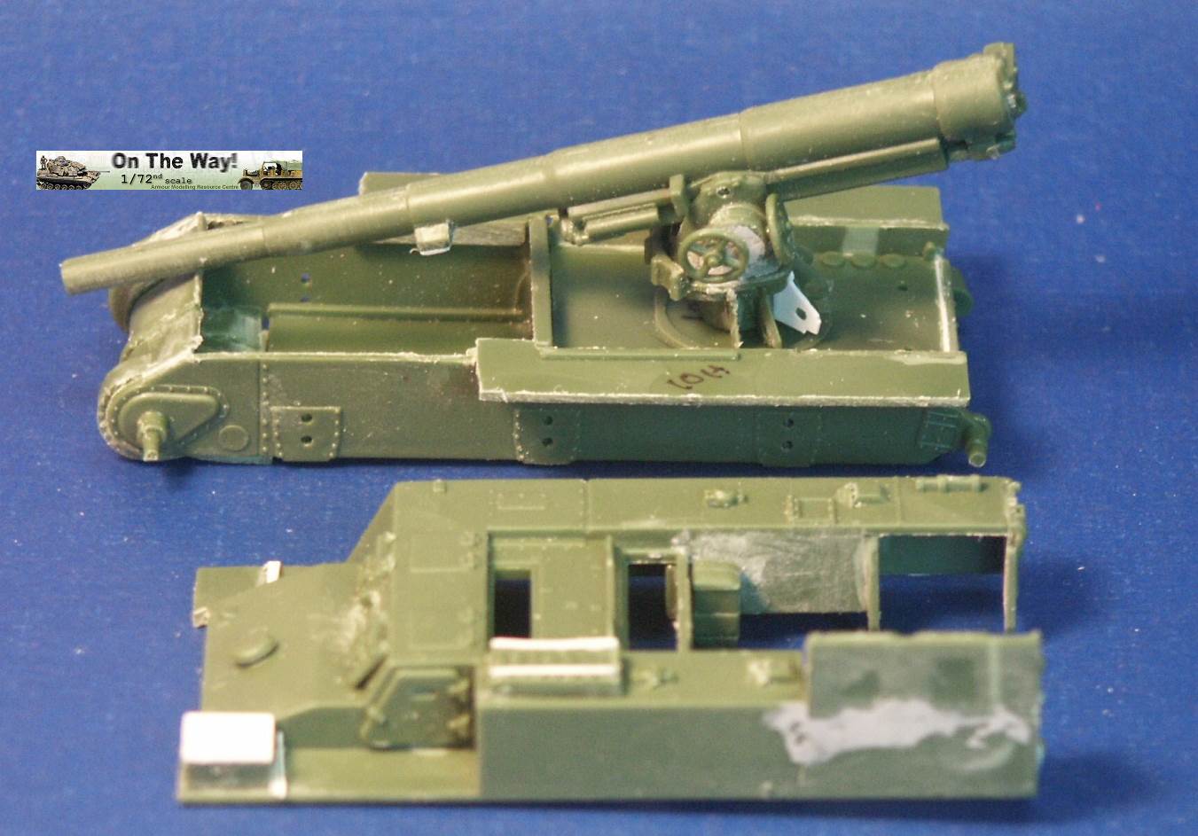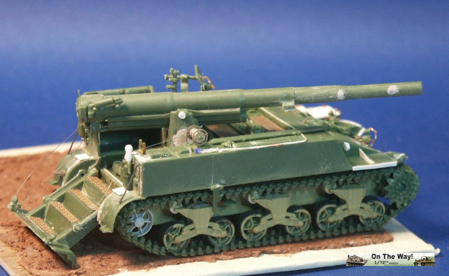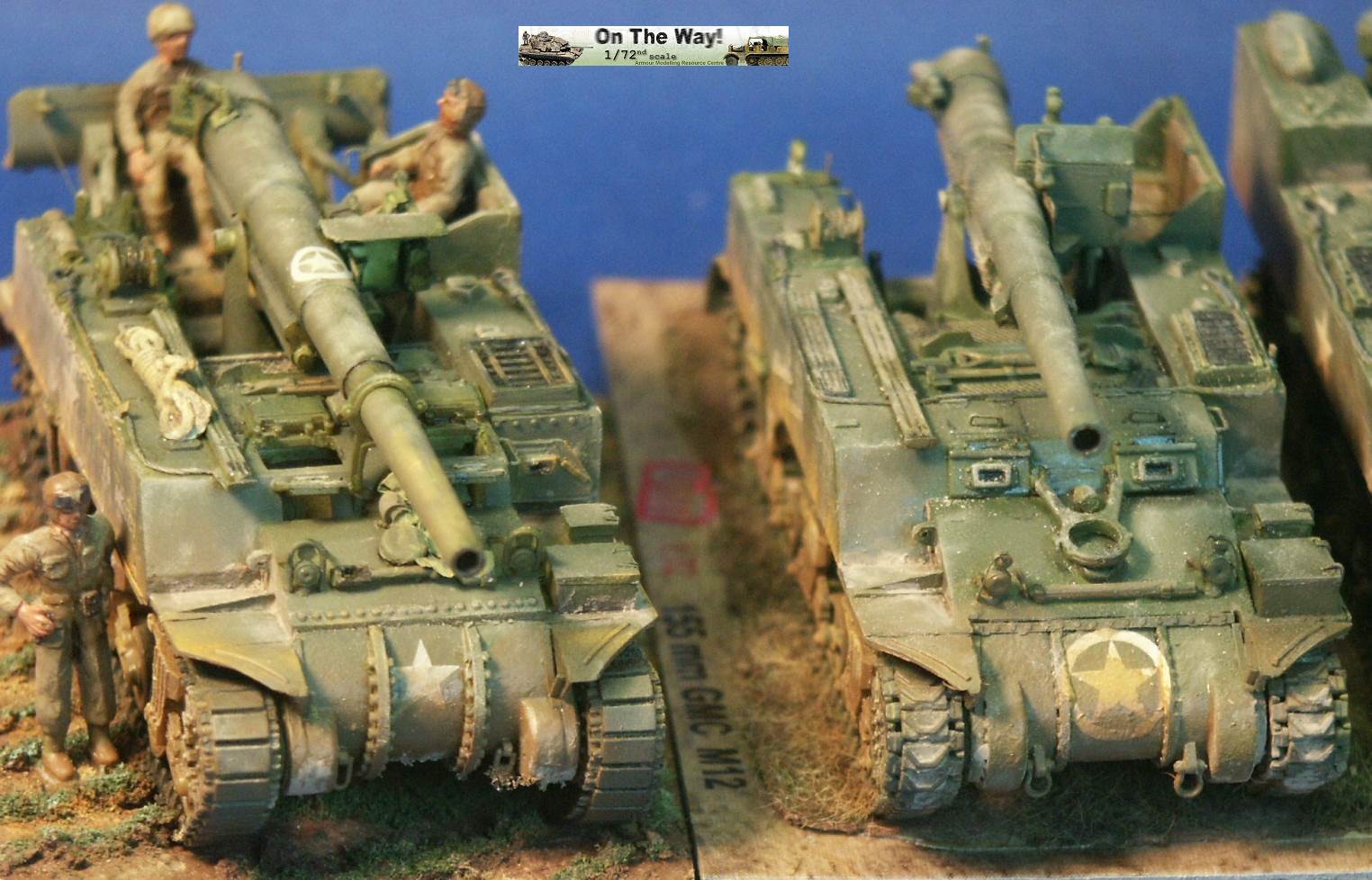 for me I finally heard from another modeler who had the same problem. The UM lower hull for their M12 and M30 assembles in a similar way to their M4 Sherman model kits. Notice that at the very rear of the gun compartment floor (part 10C) I had to fit in a fillet of white plastic to fill in a gap. The UM M12 kit 211 upper superstructure has fewer parts for the main superstructure than the ESCI M12 model but has considerably more parts for the interior and for the tools and gun. Notice the gray model putty to blend in the seam for the parts 33C and 12H. Notice that the gun has a white scratchbuilt replacement brace for a gun pedestal part (part 29H) that I lost. In the forward area of the gun compartment we can see one of the square air cleaners for the engine. The UM M30 kit comes with round, cylindrical air cleaners; I think it was a nice attention to detail to not just give the two kits the same air cleaners. The M30 and M12 were based on essentially the same hull, but in historical photos I have seen many little variations in the wheels and fittings. The gun shield (parts 24C) for UM's M1917 gun appears much more accurate than the ESCI part 16 and is enhanced by nice etched brass parts. The grouser box (parts 3H) has been given two strips of styrene to simulate the braces to hold the grousers in. The UM M12 model features a well rendered gun sight that is not supplied in the ESCI M12 model. The details on the UM 155-mm gun compare well to my reference photos, so I used it to help correct the details of the ESCI gun. An easier way to get a better gun for a great display model is to use the M1917 155-mm gun from one of the RPM GPF gun kits (see this review). The rear spade for the M12 is assembled except for the etched brass tread plates. Notice the scratchbuilt brace on the forward mudguard (fenders). Both mudguards on each M12 and M30 will need these braces. With the upper hull largely molded as one piece, the UM kit is missing the line of rivets along the upper edge that is present on the ESCI M12 model. Looking where the upper hull meets the final drive assembly I am unhappy about the fit; despite sanding and some trimming the upper hull sits too high, or the final drive assembly sits too low. A comparison of the UM wheels with the ESCI wheels shows the greater number of parts used in the UM suspension and the overall better rendered detail of the UM parts. To be fully frank, the UM suspension, though better than the ESCI parts, are still not as well done as the Dragon and Heller Sherman VVSS bogies and wheels. These are the same suspension parts as included in the UM and the ESCI M4 Sherman Medium Tank kits. Above and below are photos of the VVSS bogie assemblies used for my M12 and M30 models. To add some variation the two vehicles were given different wheels. Closure views of the UM bogies in various stages of assembly and different roadwheels, and variations in the track skid. The underside of the hull is the same as in UM's M4 Sherman model kits. Without having seen the underside of an M13 GMC, I surmise that this underside is incorrect as I suspect the engine plates should be in the hull center since this is a mid-engine vehicle. Compared to the 1/72 scale UM M30 kit built in conjunction with this M12 model, with the M12 I opted for an early variant with the open spoke roadwheels and idler wheels and early style track skids. The front mudguards have been given a scratchbuilt brace on both sides, the storage boxes have been given new lids, and the grouser box has been given two braces on top. The light gray model putty filler is obvious where part seams needing filling. At this point we have skipped ahead: what is new is the strip of plastic at the front, simulating the strip of sheet metal for hanging the side sand skirts, like those seen on the Sherman tank. The strips had a horizontal line of bolt holes. In historical photos I have never seen the side skirts actually fitted to an M12 or M30. A Heller kit open spoke idler wheel (the pale gray wheel at the rear) has been substituted for the UM idler wheel (part 3A). On top of the superstructure is a tow cable made from string and mounted to the deck. Neither the UM M12 nor M30 include the towing cable. The