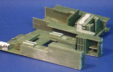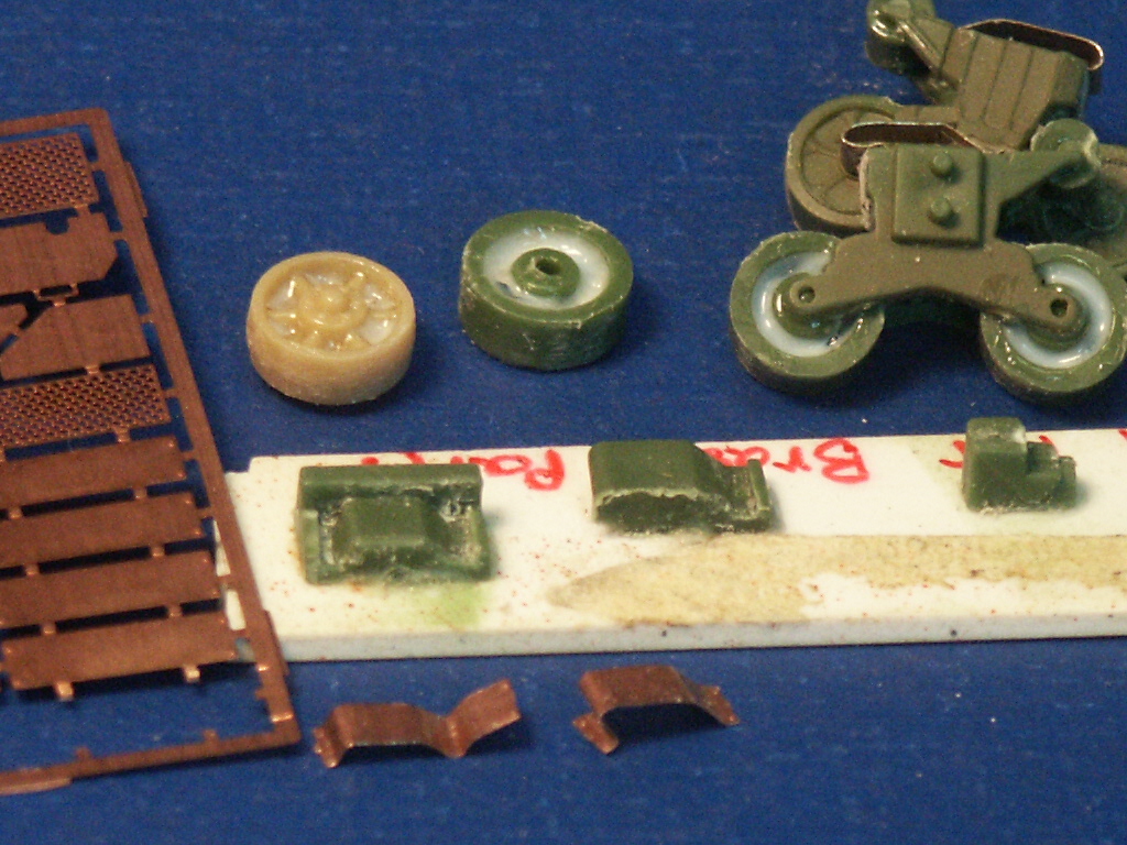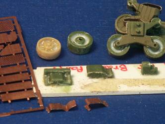 article till after I completed my models. All the M12 and M30 were produced with the 3-part bolted final drive assembly cover. Near the headlights are what appear to be lifting rings on the side of the superstructure. I have seen these lifting rings on both the M12 and M30 in most, but not all, historical photos of the vehicles. Neither the UM kits or the ESCI kit include these lifting rings. The UM M30 kit 226: we see the forward part of the upper hull is the same as the M12 but the M30 rear section of the hull is redesigned for significantly more ammunition storage. Sitting on the deck of the lower M30 hull is a storage rack of 56 artillery shells (parts 2C). The long vertical tubes I suspect hold the cartridges and propellant. Good reference photos for this vehicle are uncommon; on the ones I have, it shows the ammunition tubes stored horizontally. Using major surgery on the lower hull (parts-10B & 11B) the front parts for the final drive were cut off to prepare for a replacement final drive assembly. In the past I've assembled two of UMs final drive assemblies and I was not looking forward to building one again (see my reviews of the UM M12 and a UM M4A4 kit to see what I refer to). To the right is an extra resin 3-piece bolted final drive housing made by Wee Friends that I will mate onto the plastic kit. Mating this resin part to the plastic kit is easier than assembling another UM final drive (parts 15, 64, 65, 104 & 105). The back of UM's stamped type roadwheels (parts-5A) are hollow so considering that some contest judges like to look under the model, the hollow well was filled with white glue. Below are the forms included in the UM Sherman kits for bending the brass light brush guards (parts-8F) and the track skids into shape. At the bottom are some etched brass skids bent into roughly the shape for mounting on the VVSS bogies (at upper right). The Wee Friends resin final drive part has been glued on with super glue and a big gap is supported with some blocks of styrene. Several of the return rollers had scratchbuilt return rollers instead of the kit parts-6A. The hull bottom is missing a few details but does have the escape hatch and is more accurate than the ESCI kit.