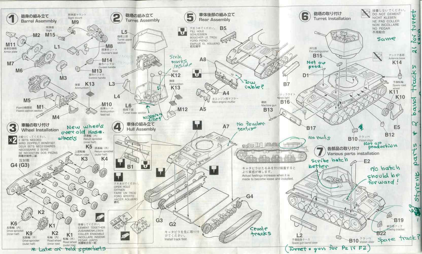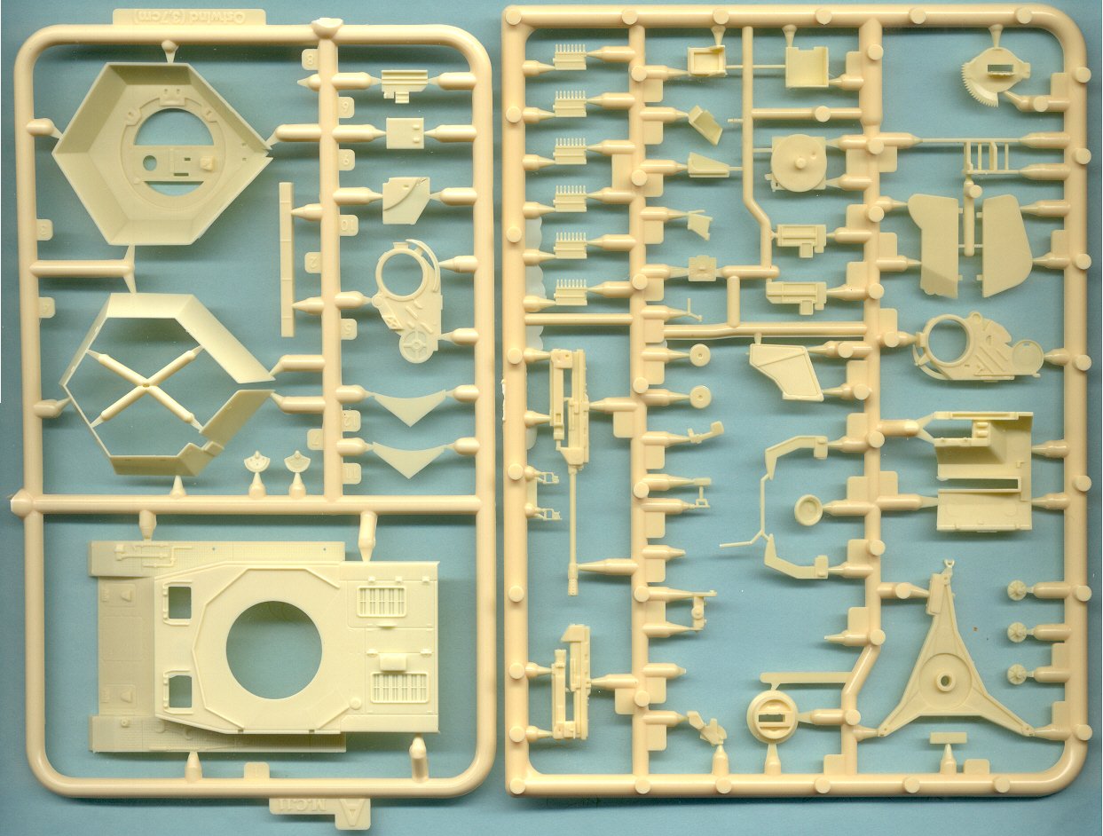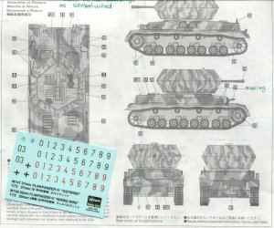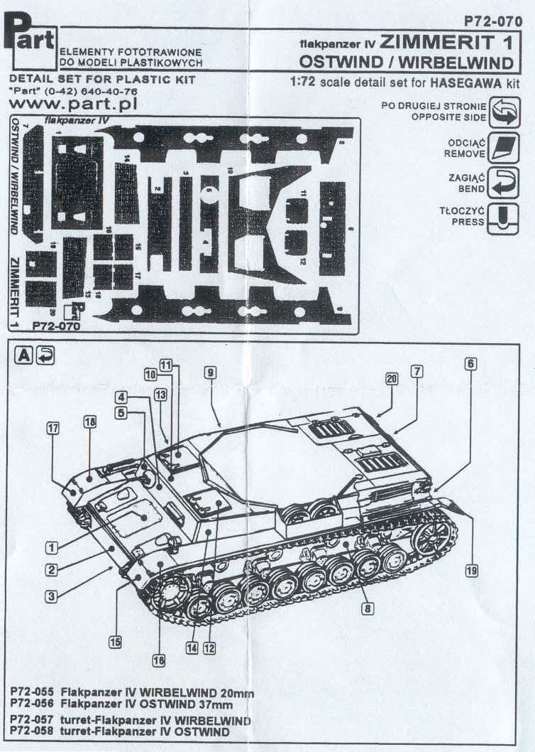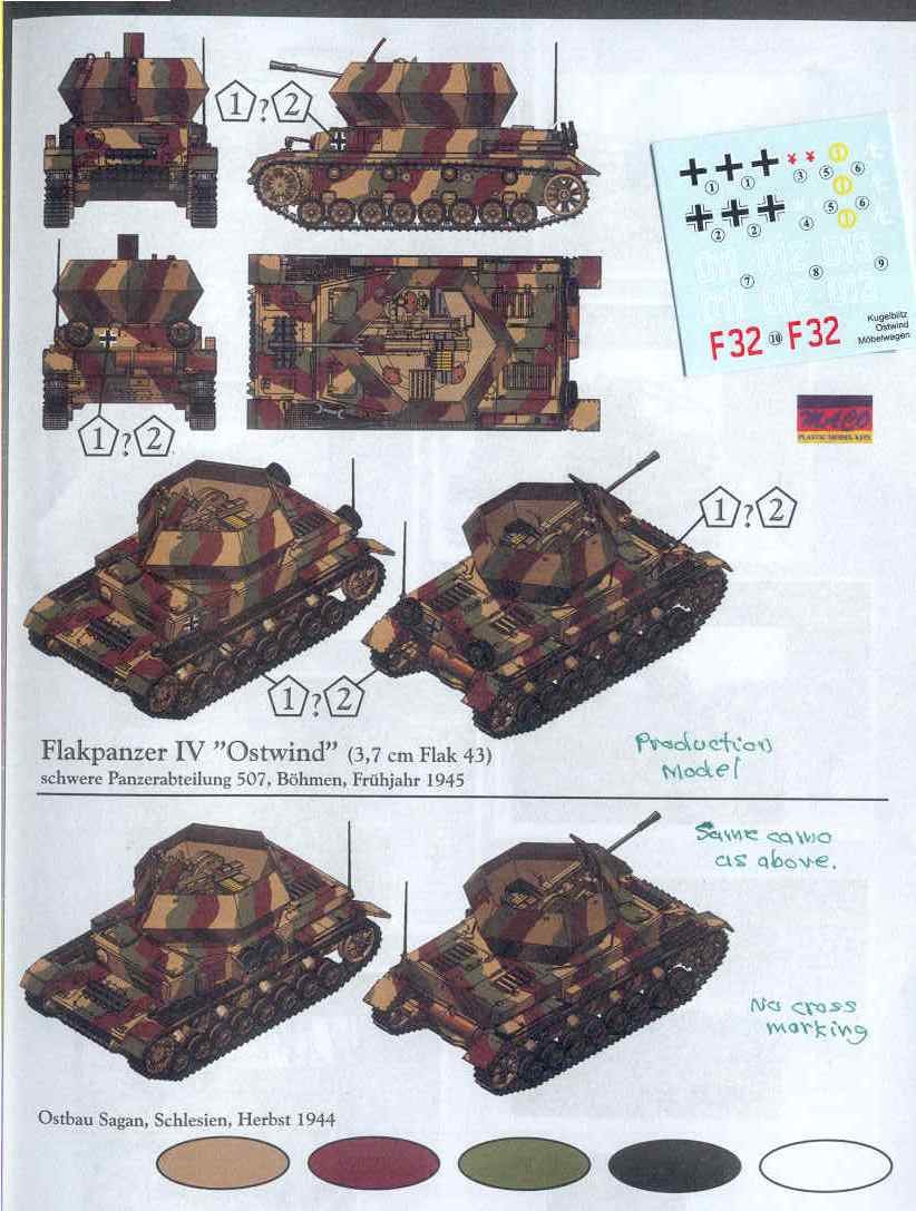 Manufacturers In the two photographs above, the left sprue is the Sprue-A, which is particular to MACO's Ostwind kit containing the 6-sided open-top turret (parts A4 & A5), some Flak 43 parts particular to the Ostwind kit, and the modified Pz IV upper hull (part A1). Why not use the Revell Pz IV hull you ask? Look at the placement of the radio operator hatch and you will see that it has been moved forward to make room for the Ostwind's larger turret ring so the engine hatches could be opened with the larger turret. The molding looks very good and the turret shell appears very thin. The right sprue is Sprue-D for the 3.7cm Flak 43 which is common to the MACO kits 7202, 7206 7211 and others. Molding and detail are very good. Many parts appear very delicate so be careful when cutting them from the sprue. Some parts such as the gun base (part D1) and the shield (parts D33, D34 and D35) are not used with this Ostwind model. Like with the Hasegawa kit we will need to drill out the muzzle of the gun barrel. In the two photographs above are Sprue-L (left) and Sprue-M (right) for Hasegawa's Ostwind and turret and Flak 43 gun respectively. The turret (parts L5 and L6 ) is the same basic shape as MACO's though the plastic is thicker. One of the first things I noticed when comparing the Hasegawa and MACO models was the significantly greater number of parts in the MACO kit. Hasegawa's molding quality is very good, though the detail is simplified compared to MACO. This Hasegawa kit includes their stock upper Pz IV hull that was used with the Ostwind prototype, not a hull with the revised radio operator hatch location. Though not typically seen after the model is built, it is clear that the underside of the Revell Pz IV (at left) is significantly more accurate than the Hasegawa kit. Both lower hulls are made of four parts, in contrast to Trumpeter's and Dragon's Pz IV hulls, which are slide molded in one piece. At this stage the gray Hasegawa hull looks significantly longer than Revell's. The wheels and tracks for these two kits (Revell/MACO tan sprue, Hasegawa grey sprue-K & black tracks) we have seen before in the Revell and Hasegawa Pz IV model kits. Revell's roadwheels look more correct and assemble well (I prefer to assemble and paint my wheels while still on the sprue). Hasegawa's roadwheels are the type with cast hubs as seen on the Pz IV F and G while Revell's roadwheels have the forged hubs as seen on the Pz IV H and J. Hasegawa gives us a choice of two different styles of sprocket wheel: mid-production (for a Pz IV F or G) or late production (for a Pz IV H or J). Revell's sprocket wheels are the late war type. Both offer the same style of idler wheels. MACO provides Revell Pz IV link & length tracks which I find a little thick but well done. I would prefer for MACO to provide some of their own Pz IV tracks I have heard good things about. The Hasegawa soft band tracks are dismal and are best covered in snow or mud for a display model. (CMK, MACO, OKB GRIGOROV companies and others make aftermarket Pz IV tracks in 1/72 scale.) At the top of Hasegawa's sprue-K we can see 3.7cm ammunition clips (parts-13) for the Ostwind and a spare 2cm cannon barrel box (part 15) for Hasegawa's Wirbelwind model, and an antenna mount (part 14). Assembly Instructions Both MACO and Hasegawa offer parts diagrams within their instructions. The 30-step MACO instructions appear complete and clear. For this review the pages of MACO's assembly instructions I have included here mostly cover assembly of the Ostwind turret since the Revell Pz IV parts are included in other kit reviews. The spent cartridge tray (part A10) shown in Step-16 has a wire basket in my photo references that we may wish to scratchbuild. On the parts diagram at the left in the above picture, the unused Revell parts are not shown, but most all are still there on the actual sprues giving us a bunch of extra Revell Pz IV H parts to play with. The MACO Flak 43 instructions look pretty clear. Note that with both kits it is advised to assemble all the turret interior parts before attaching the upper turret half. Some fine weld beads along the many welded edges may be a nice touch. While the spare roadwheels here in Step-30 are mounted on the port side like as seen on the Pz IV, a reference photo of a production Ostwind shows the two roadwheels mounted on the corners of the rear plate which is an interesting variation, similar to the Stu.Pz.IV Brummbar Sd.Kfz.166 spare wheel storage. Hasegawa's instructions have fewer steps reflecting the fewer parts and standard format for most 1/72 scale Hasegawa armor kits. Since this kit represents the Ostwind prototype the chassis is a standard Pz IV Ausf. G. For reviews of the Hasegawa Pz IV kits try here and here. I did not include a scan of Hasegawa's parts diagram but my kit included all the parts for a full Pz IV Ausf F2/G (compete turret and gun) model. MACO's color painting and marking guide above is typical of MACO small scale models and displays two Ostwinds with both the same 3-color hard-edge camouflage scheme, the only difference is that the bottom vehicle has no balkenkreuz markings. The small decal sheet also includes markings for the MACO Modelwagen and Kugelblitz kits which will go unused for the spares box. Hasegawa gives us a black & white drawing of their Ostwind which is typical of Hasegawa small scale armor kits. The 3-color camouflage scheme on the turret is a different pattern than on the chassis which likely reflects that it's a rebuilt Pz IV chassis modified to carry the Ostwind turret. The only marking appears to be small unit marking (decal number 2). There is no balkenkreuz or number markings to be used. This decal sheet is shared with the Hasegawa Wirbelwind kit and most of the markings go unused. A nice feature of this decal sheet is that with a little extra decal film coating over the kit title at the bottom, it can be slid off and placed on a display base for the completed model. Conclusi