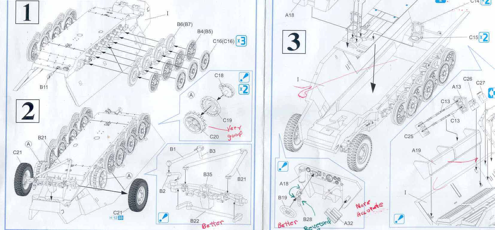 IV. The Suspension The Sd.Kfz.251 had interleaved roadwheels and rubber padded lubricated tracks common to most German halftracks of the time. In 1944 the Germans experimented and soon dropped the idea of steel padded tracks so as to save on scarce rubber. Both DML and Hasegawa have the correct 14 roadwheels; the rear roadwheel doubles as the idler wheel. Second from right are DML’s