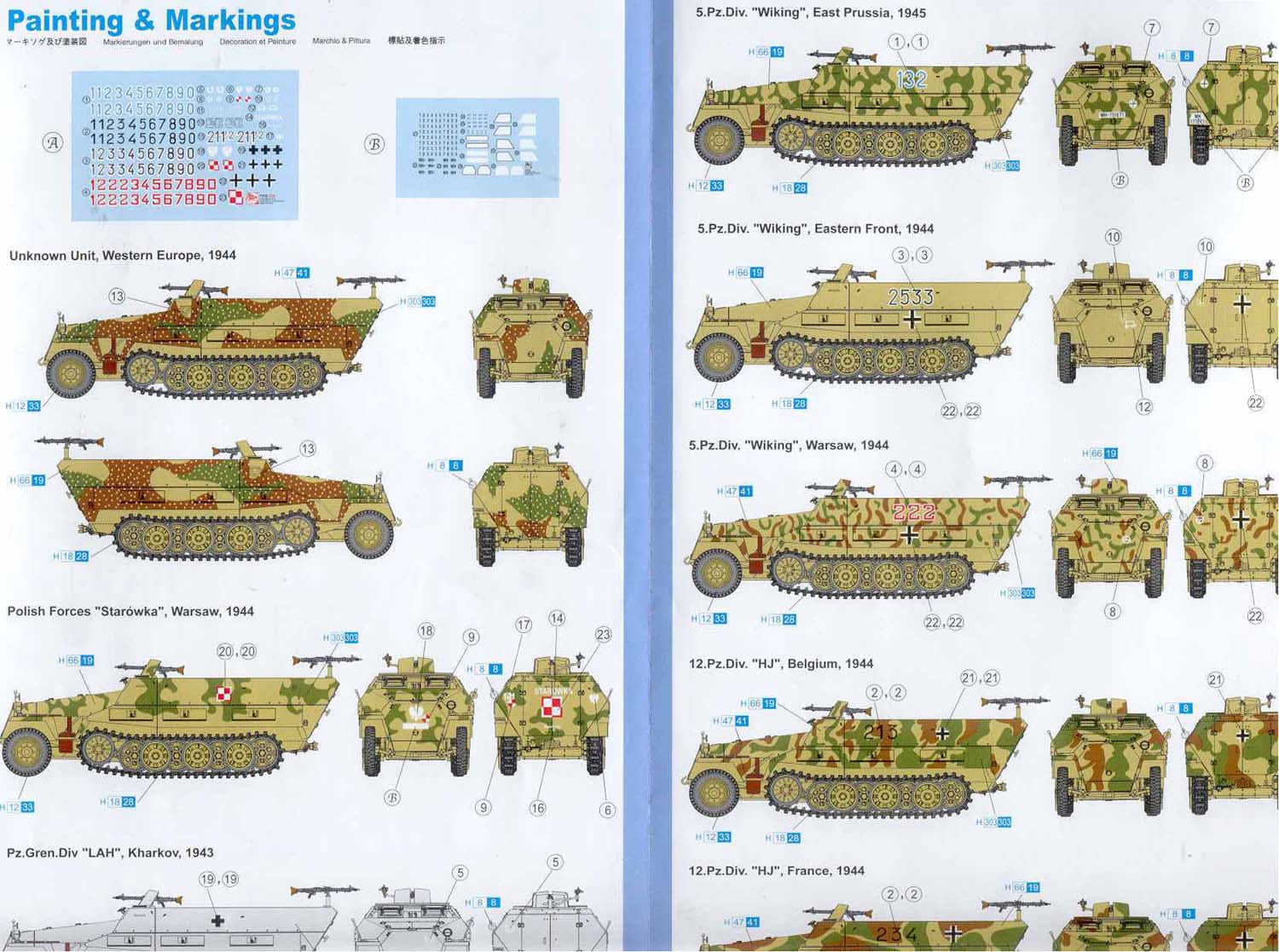 VI. Painting & Markings DML offers full color three view drawings for all their depicted vehicles, which is great. Many diagrams are of vehicles that appear based on single, rare black & white photos, so I would take the accuracy of the scheme and markings with skepticism. For example, many WW2 era vehicle photos show only two oblique sides at best, so knowing the markings and colors on all four sides is artist’s license. You do the best you can do, and who can prove you wrong? Except for Hasegawa’s color box art, their color & markings instructions are in black and white and are adequate. If you use Dragon’s color chart take note that they describe the base vehicle color H66/19 as RLM Sand Gelb 79 (a Luftwaffe color). From all my references I understand this should be Dunkelgelb nach Muster (later numbered RAL 7028) which is also a tan color. Dunkelgelb was used from February of 1943 till the war’s end in 1945. Sand Gelb RLM 79 was a darker and more tan color used in North Africa and the Sd.Kfz.251 Ausf.D was never used in Africa. As for the vehicle interior; prior to the February 1943 change, the interior of the Sd.Kfz.251 as well as the Sd.Kfz.250, was painted off-white in the forward driver’s area, and the exterior gray color aft of the flange holding the front to the rear. After the switch to Dunkelgelb [dark yellow] the driver’s area was the same panzer yellow as the rest of the vehicle. In the above Painting & Markings
