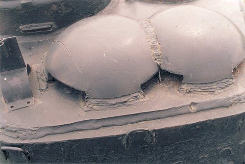 4. This is a photo of the rear of a T-34-85 turret showing the turret roof's twin armored ventilation covers. The crude welds on the vents are very interesting. Welds like this I have rarely seen duplicated on either 1/35 and 1/72 scale models. The object at the far left is unbeknownst to me. At the bottom of the photo we can see two of the six U-shaped lash points for stowage on the rear of the turret (three on the top row and three on the bottom row). Below the hooks are what appears to be casting numbers [LEVA Productions is the only small-scale model company I am aware of that molds in casting numbers]. The position of the cupola-view port visible in this photo has always puzzled me. What can the commander really see with the vents and other fitting in the way?