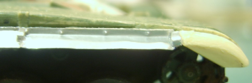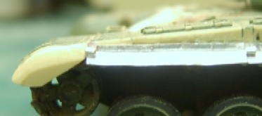 With the most of the hull and turret done, there are one or two other bits that still need to be done which are the side skirts. These can be made out of either plastic or metal foil, I preferred the foil because a, they have a nearly 90 degree bend in and with foil it is easier to show the attaching screws by simply making an indentation from the rear, not so easy are the front portion of the fenders although the kit piece can be used. I made mine out of a 4mm wide piece of foil from a metal food tray, one side is then bent up to around 60 degrees a distance of 1mm in, in the 1mm wide part the indentations are made on the reverse side. the front portion is taken from the kit side skirt, I added a 0.5mm thick piece of plasticard to the back, to make the front portion wider, this is then filed at an angle the same as the foil skirts. The other parts in the pictures are fittings for the swing out armour plates or Gill Armour as it was called.(missing from these pictures are the small square portions seen on the outside edge of the front fender) around the rear, the kit part has to be made smaller and also made to an angle, there is enough plastic to allow this. As you can see there is a gap for the exhaust. That about completes the changes made to backdate the Revell kit. The turret changes also apply to the ACE kit, as do the hull changes, although this is more difficult due to the fact that the ACE kit has the extra armour on the glacis moulded in place, making it difficult to remove. In future articles I will be correcting the turret for the T-72M, the T-72A(T-72M1) and the T-72B, and finally I will hopefully be able to fine enough material to make the T-90 welded turret, plus all the modifications needed to make a correct T-90. A note on the fuel barrels A quick note on the Fuel barrels, the Czechs devised a system for allowing the rear fuel drums to be fed directly into the vehicle fuel system by means of hoses linking each fuel barrel to the rear right hand fuel pannier above the tracks, this system was not adopted by the Russians and so it would be wrong to model any early Russian T-72 with this system, the reason being that the Russians didn't invent it and so disregarded it. However they are now getting over the fact that it was not invented by them and have started to use the system on their own vehicles, so it is worth noting when modeling a vehicle from a specific period in time, the system has so far appeared on the T-90 and Rogatka tanks but it is also possible that it has been retro-fitted to other vehicles. |