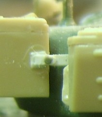 As can also be seen in the picture above, two hand holds need to be added, one either side, these fit low down on the turret. Also the two flat plates either side of the main gun that are present in the kit will need to be replaced as they will be lost in the reshaping. The final changes to the turret concern the rear turret bin, firstly there is a part that needs to be removed, shown by the yellow box in the picture below, this will mean that the removed wall will have to be replaced in line with the lid.
