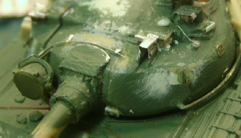 One final modification that I had to make to the turret concerns the main gun, the reshaping of the turret front now causes the kit gun not to fit properly, this can be fixed in two way. You can either blend in the existing kit piece to the turret front using putty, or you can as I did make a new canvas cover. I chose to make a new cover as beneath the canvas there is a small plate that can mostly show through, I chose to use foil and embossed the plate to the reverse side using the Part T-55 set (piece #46) with this lightly embossed onto the foil, I then cut the shape of the new canvas, I also removed the top of the moulded canvas that fit to the turret roof, the gun was then glued in place and the new canvas fitted around it and then all was blended together using putty. There is no fixed way of doing this and it is which ever method you find that suits you. After the canvas was fitted there is a small retaining wire that needs to be added to the turret roof, this runs around the top of the canvas and extends either side slightly, it is held in place by two brackets on the roof.