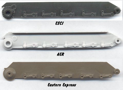 There is not a wide range of quality with these parts. Both the ESCI and Eastern Express parts have more, and finer, details than the AER kit, but none of it will be visible on the final model anyway, since the wheels block the view. If somebody wants to make a diorama with a T-34 missing some wheels, then I would steer clear of the AER kit. Notice also the incorrect axle spacing on the AER chassis. There is a semi-circular ring of bolts extending up from rear sprocket mount, best seen on the ESCI part. I don't know what this is, but based on my 1/35th scale T-34 kits, it looks exactly like what is shown on the ESCI kit part. The AER kit part looks wrong, and it is lacking entirely from the EE kit part.