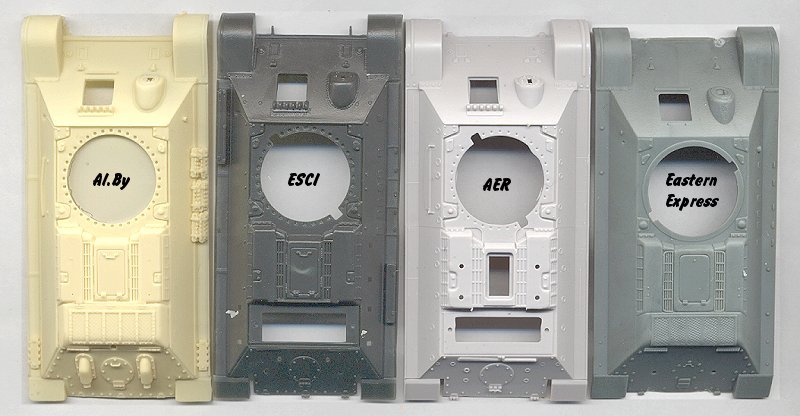 As one can see, none of the kit hulls are truly bad. I'd say the roughest one of the bunch is the AER piece, because the engine grates aren't nearly as finely molded as on the other kits, but even so, it's still a fairly decent hull. I like the ESCI and AER hulls for having the option of posing the engine screening hatch open if desired, but the actual hatch on the AER kit (not shown) is not very well done. The Al.By hull was originally based on the ESCI kit, so they are almost identical, but the Al.By has some obvious improvements made to it. I consider this piece to be the best hull of the bunch. My second favorite is the Eastern Express hull. Although the engine screening hatch is molded on, the detail is very fine, and I feel that the shape is more accurate the other hulls. As one can see, the top plate of the hull is shorter than on the other kits, which makes the side walls a hair taller, and the front glacis plate slightly longer. When compared with scale drawings of this tank, I think that this is closer to reality. However, this discrepancy between kits is not really apparent, unless they are sitting next to each other like this.