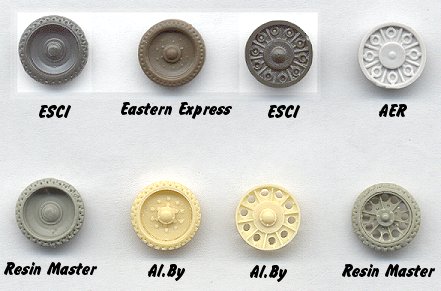 The wheels from all the plastic kits are in the top row, and various resin wheels in the bottom row for comparison. Basically, the plastic solid disk wheels are pretty good, while the plastic all-metal wheels are poor. The AER wheel in particular, is very bad (poor depth of detail, and incorrect number of holes). If you want a pierced metal wheel, I'd recommend buying an Al.By kit. As I mention in the Al.By kit review, their wheels are spectacular, and I really wish that Al.By would sell their wheels separately. The Al.By solid disk wheels are likewise incredibly well done. I guess the best plastic wheel is the Eastern Express example, but the hub does not extend out nearly far enough. The Resin Master solid wheel is simply a copy of the ESCI wheel. The Resin Master pierced wheel with rubber tire ("spider" style) is also very good.