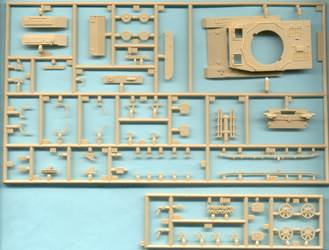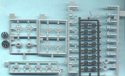 Revell's Panzer IV Ausf. J kit #3122 contains about 211 well-molded styrene plastic parts on four sprue; 46 of the parts are link & length track links. One sprue is different from Revell's kit 3119 and contains the cast idler wheels of the Pz IV J, spare track links, new turret doors, and the two exhaust pipes. Parts like the tubular welded idler wheels (parts 16 & 17) and the horizontal muffler (parts 3 through 6) are not to be used.