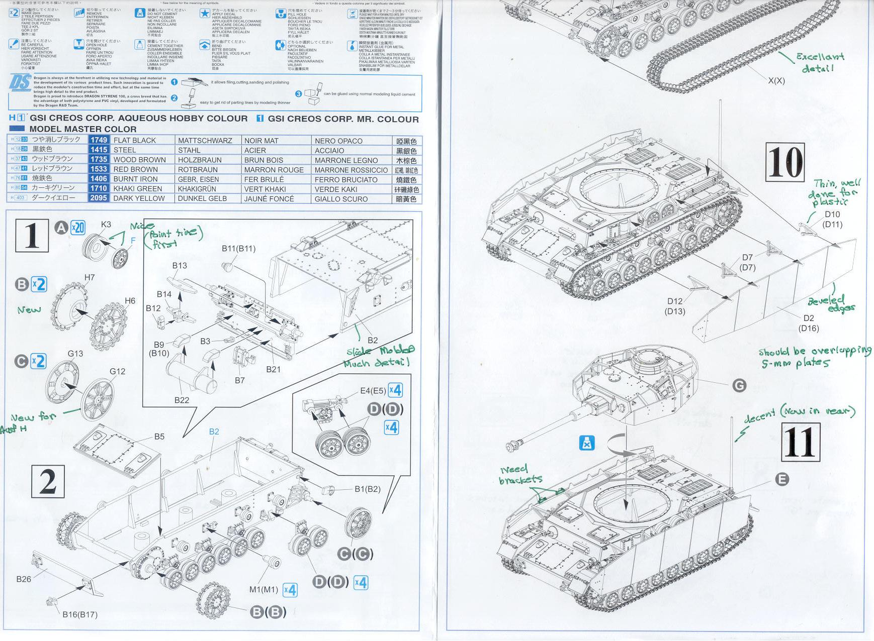 To better examine what makes a representative Panzer IV Ausf. H, I took notes on the Revell Pz IV H instructions. For me the identifying feature of the Pz IV H is the air cleaners on the starboard mudguard. At upper left is Revell's water-slide decal sheet for two Pz IV Ausf. H vehicles.