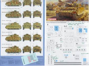 Typical for DML small scale kits is the 3-view painting and marking guide at left. All the three or two color camouflage schemes appear to be soft edge sprayed on. Water-slide decal markings for Pz IV tanks are supplied: two for 2nd Panzer Division in Normandy 1944, and three for Germany's Russian Front in 1943 and 1944. The small decal sheet is at the lower left of this scan.