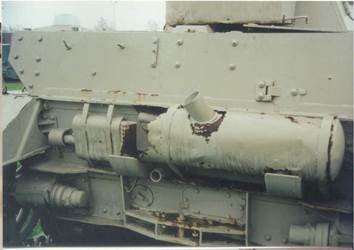 This last photo shows the rear of the Pz IV and is pretty characteristic of the Pz IV F through the Pz IV H. At bottom center is the towing attachment with the left and right idler wheel assemblies. In center is the large cylindrical muffler that looks original and rusted away at the left end so as to view the interior. The muffler is held on by two straps and by two supports that also hide the exhaust piping.