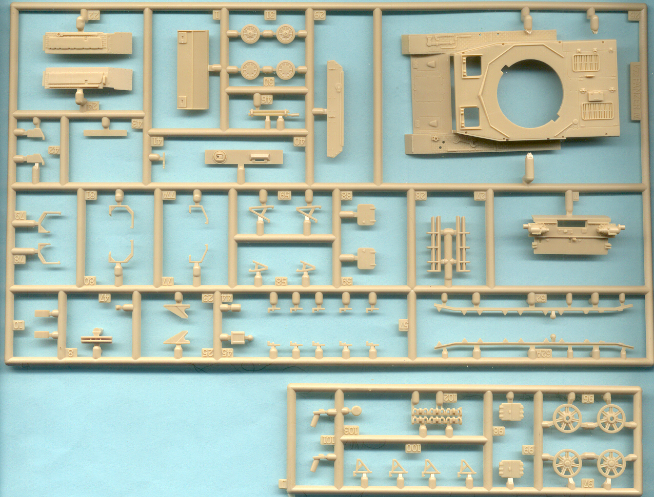 The small sprue at the bottom comes in the Pz IV J kit 3122 only and contains the cast idler wheels (parts 96 & 97) particular to the Pz IV Ausf. J and some late production Ausf. H tanks. These idler wheels replace the tubular idler wheel parts 16 & 17 which are for the Pz IV H kit or early Pz IV J. Left of the idlers are two new turret doors, which differ in having no view ports. Next are four hull skirt brackets (parts 100), some track links that mount on the hull side (parts 102), and the two flame suppressor exhaust pipes (parts 101) that replace the horizontal, cylindrical shaped muffler.