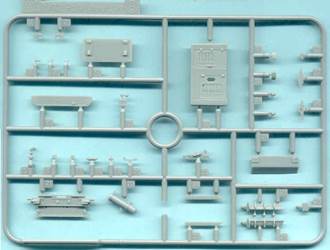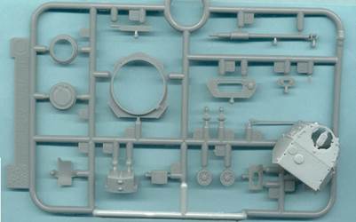 In the center are the turret parts molded in four main parts to DML's three turret main parts. The side doors for the turret (parts 73 & 74 or parts 98 & 99) mount into the rectangular depressions in the turrets sides (parts 63 & 64). If we wish to mount a side door open, we'll need to open up the turret side and add some interior detail to the small doors.