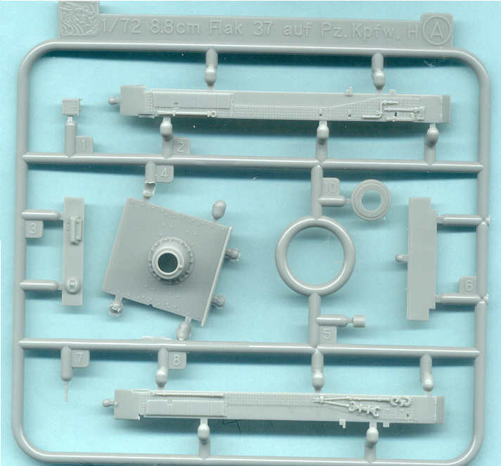 As evident by the title on DML's sprue-A here, this sprue is originally for a 1/72 kit of a rare variant of the Pz IV mounting an 8.8-cm Flak 37 gun and pedestal. Unused are the floor plate with the gun pedestal (part A4 in center) and part A6 at right. The handtools are molded to the mudguards like with the Revell kit. (Both manufacturers' kits would make better display models with separate tools.)