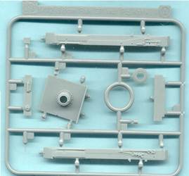 On DML's sprue D we see some delicately molded brackets for hanging both the turret and the hull skirts. Please note that the rear section of the turret skirt and the spare roadwheel holder that are attached to this sprue-D are not shown in this scan. I understand that this style of skirt attachment with the triangular hanging points represents a middle or late style of attachment for the Pz IV H; the Ausf.G and early Ausf.H used a hook that went through holes in the skirts.