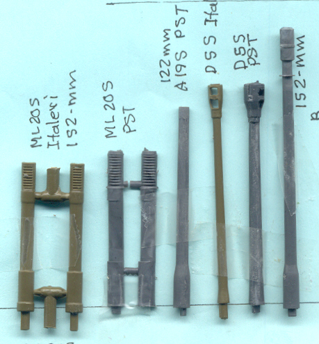 Italeri mantlets. At far left is PST’s 122-mm D-5S barrel with