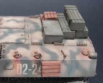 The photo above shows some other types of boxes stowed on a Russian BMP-2. Similar boxes are easily made using sections of plastic strip. A wood grain texture can be added to each strip using a scalpel by simply scratching the blade along the length of the strip several times. An alternative to this is to drag coarse grade wet and dry paper along the strip. Ive seen some photos that show quite flat stowage items that look similar to pallets and these can also be made in a similar fashion.