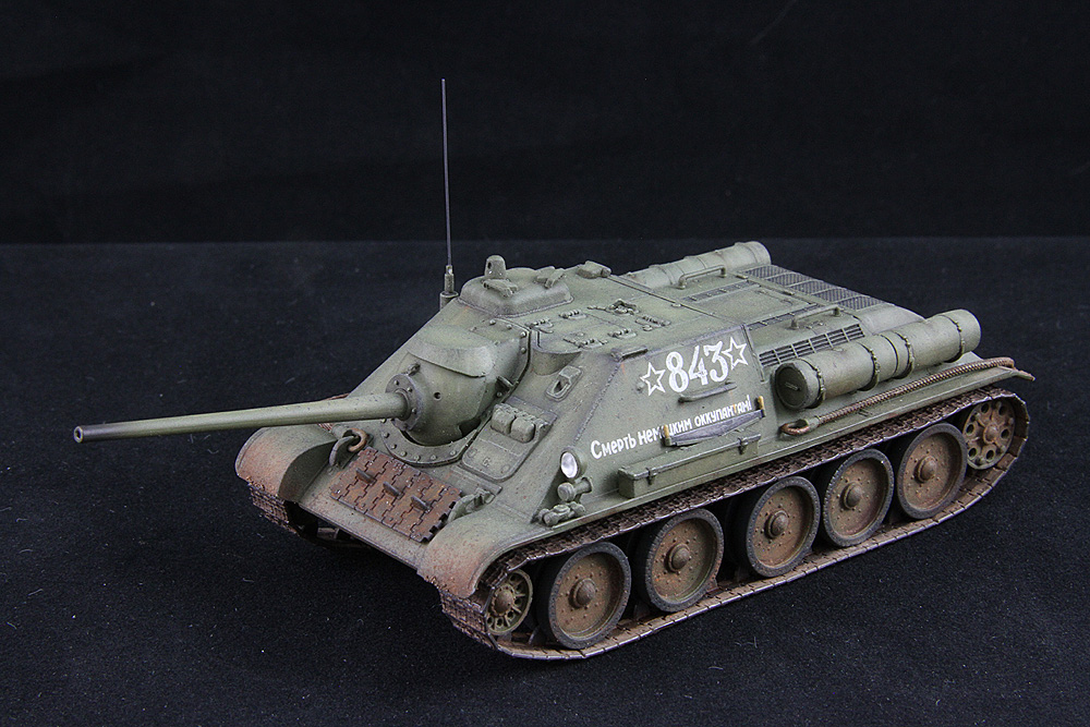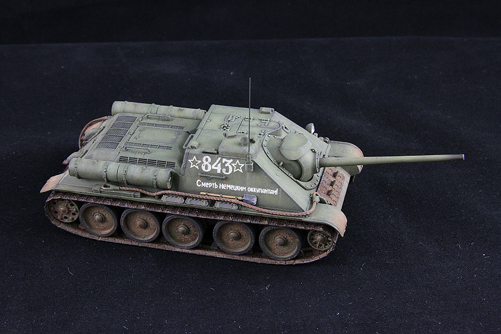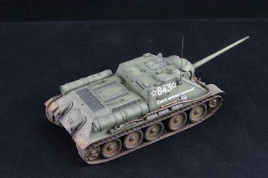 | This is Zvezda’s 1/72 SU-85, built pretty much out of the box with the exception of the head light lens from Little Cars. The kit was generally a pleasure to build except for the one piece tracks, which were difficult to impart the curve around the idlers, were a very tight fit when installed, and did not align well with the locating pins on the centre road wheels. |