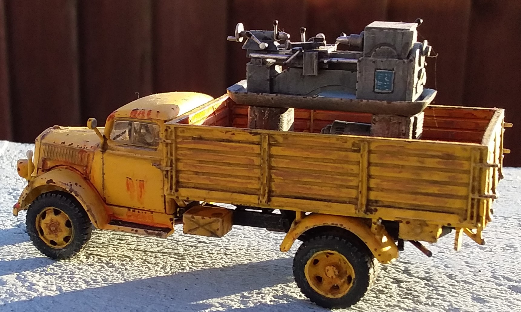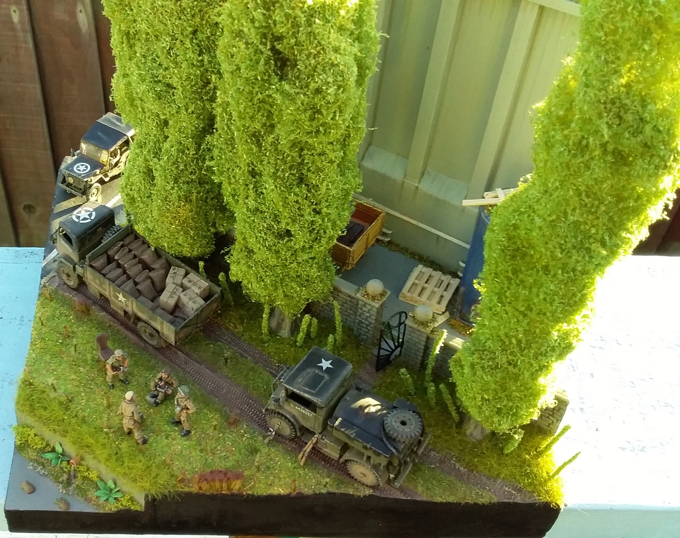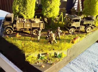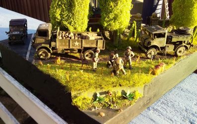 down it. I made the lathe from scrap plastic and balsa. In the middle of it is a spare wheel holder from an IBG CMP truck. The passenger in the jeep has a balsa wood leg splint with masking tape bandages. He was meant to be a tank rider but he mostly fitted in the jeep.