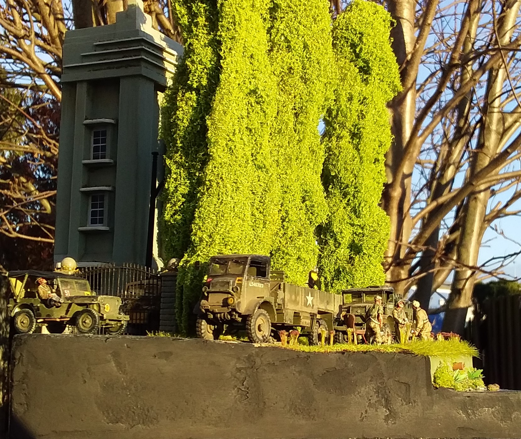 For the Poplar trees I used copper wire armatures covered in polyfibre and flock with trunks made of clay. The building is based on the Art deco style of the 30's and is made of balsa wood. I used balsa to make the cable reel, pallets, planks and ladder. The flowering grass tufts are baling twine and flock and the rest of the scenic material is by Woodland Scenics and Noch. To make