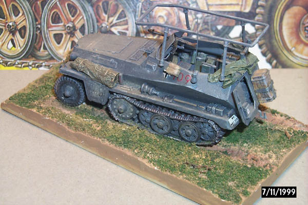 "This is an ESCI SdKfz 250/3 Alte halftrack.  I used the kit radio and antenna but otherwise rebuilt the interior with a new floor, seats, storage, tools.  I also opened up the rear door, and driver vision port in front, and detailed the radio.  Poly S acrylic paints set for 1941-42 on the Ost Front. This was fortunate to have won a silver at AMPS 1999; I guess they liked the interior work."