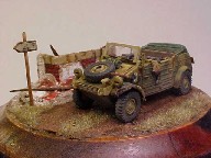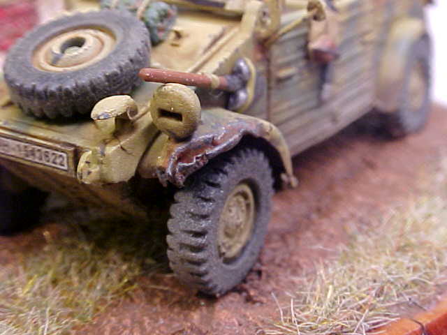 | Italeri 1/72 scale Kubelwagen. I detailed the interior with plastic, added the machinegun mount behind the front seats (the machinegun is from MMS) and the extra gear is from CMK. It was sprayed with Poly S paints and washed with oils. The soft cover is made from two part epoxy. The left front fender was replaced with lead foil and then damaged |