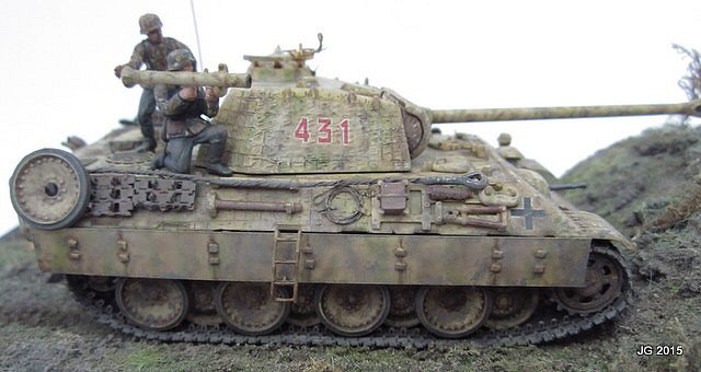 This is Esci my Panther A, which I built years ago then set aside to wait for better tracks to magically appear. They finally did, in the form of OKB Grigorov's Panther mid production resin tracks. These are magically superb castings, the quality is first rate. New tracks in hand, I added hot knife Zimmerit, schurtzen and a full complement of hangers, and fabricated the MG mount and other small parts. The yellow is acrylic sprayed, the green/brown mottle is artist's chalks, sealed with Krylon matte fixative. The figures are vinyl and added for scale effect. Let's just say the model represents a scene in Normandy as I wrote the actual unit info on the hull bottom, and the model is now affixed to the base. Most gratifying for me was finally finishing this model after two decades of sitting on the shelf and having it meet my expectations of both then and now. |