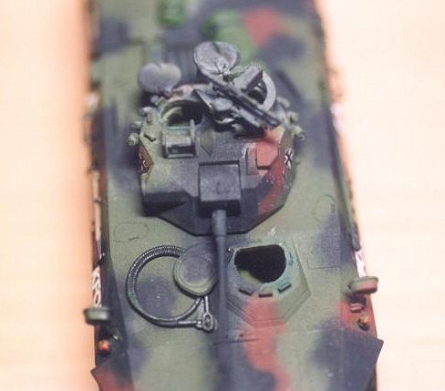 Modification: * Hatches of the driver, gunner and the commander are scrutchbuilt to be flexible with the copper wire act as hinge shaft. * The side door is flexible with copper wire hinge. * The larcels on the rear deck can be removable: stick a 0.4mm copper wire on the center of the larcels center. Drill a 0.4mm hole on the deck surface. Assemble them together. * The cable on the deck front can also be removble using the same mothod.