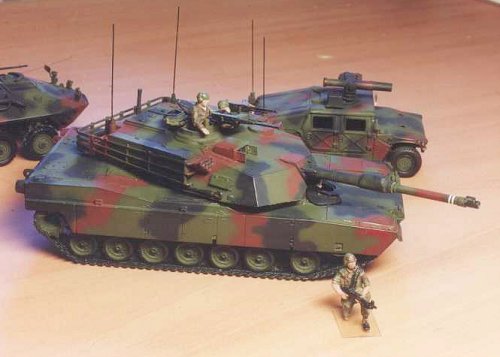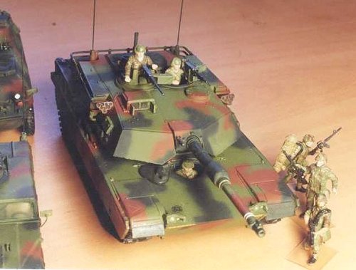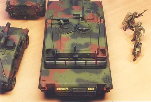 Modification: *The hatches are flexible as hinges are added with some copper wires (please see the first photo). *Crew is added. (Lower part of the crew is cut away and fitted with a 1mm wire. A plastic plate is fixed inside the turret with 1mm holes drilled on it. Then the crew can be fixed into the turret without wobbling.) *The NATO camouflage is air-brushed very well. The edge of the camouflage would not be too blur.