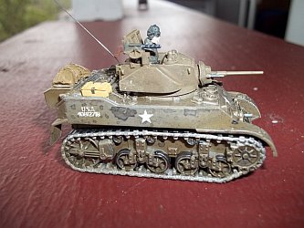 | This is the Plastic Soldier Co. M5A1 Stuart late production quick build kit. Kit comes with 3 options. I didn't use the sand skirts. |
