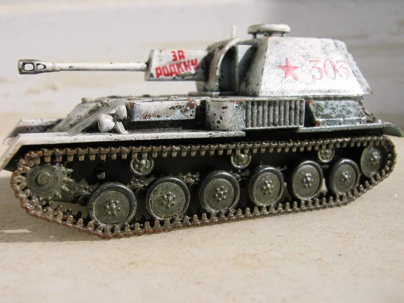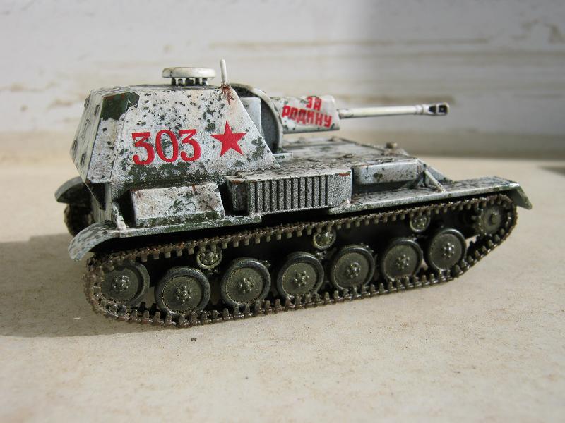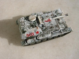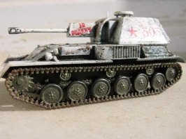 | This is the enclosed rear version of the SU-76 SPG. I found it to be a very nice kit. It was painted in Vallejo Russian green and I used the salt method to make the chipped winter camouflage. |