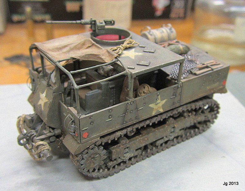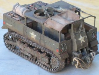 | After many years of gathering dust on the shelf, I finally decided to build this old Hasegawa M5 tractor which, despite its age, is finely molded and has nice details and parts fit. The kit's weakest link, so to speak, is the band tracks, but a hot knife and superglue keeps them together well enough. I replaced the plastic roof with a frame of wire and tissue paper. Other added bits include the window, wiper, light guards, ammo box and stowage. Something different: as I lost the decals, I brushed painted the US stars using a stencil made from paper, several layers of thin drybrushed white built up. With weathering they turned out nicely. This was a quick and enjoyable build, if you run across this model do pick it up as it still has a lot to offer. |