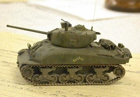 This is the Esci hull that I built originally in 1978 or so. Since I found the discussion about the hull type, I was looking for a way to salvage the kit. I decided to try correcting the Revell AG 76mm T23 turret and mating them up. I cleaned up the old hull, added wire hoist rings, handles, and brush guards, and cleaned up seams. On the turret, I built out a sheath of 5 thou card and putty, sanding it to shape. I also cleaned up the 'railroad ties' on the back of the turret, built hinges for the hatches (non-functioning), moved the ventilator, added antenna details, lift rings, hatch handles, etc from Evergreen rod and wire. I used the Esci shell/communication hatch, after sanding it down to fit, and the Esci 50 cal. AA. I reshaped the mantlet, adding better defined coax mg and sighting telescope holes, and cleaned up the gun. I used Mike Starmer's suggested mixes for the OD, new and old decals from the spares box, water color wash, and chalk weathering to finish the tank. I added bedrolls and tarps from tissue, lashed down with invisible nylon thread painted linen. Humbrol paints were used throughout.