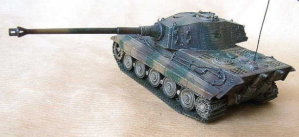 This ex-ESCI kit includes engraved zimmerit (the surface was softened with glue and the pattern pressed with an electrician's screwdriver). Hatch handles, lift rings, headlight cord and spare track holders are made of metal wire. Also the gun mantlet received some detailing. I stayed with the kit's original link-and-length tracks in spite of their crudeness, but I engraved individual link seams and added track guide teeth made of plasticard. The details on the turret roof were left slightly misplaced, however.
