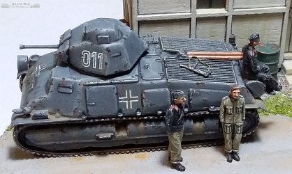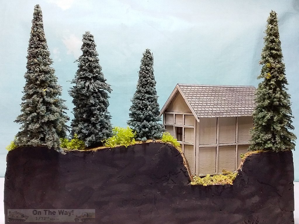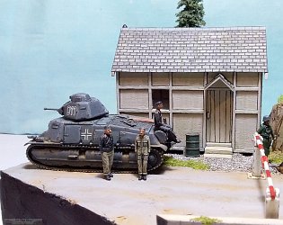The infantryman is Zvezda and the panzer crew are Orion. The two standing crewmen hide the worst parts of the Heller S35 tank; one hides the track join and the other covers the toothless drive sprocket. That's a Dragon MP 40 on the engine deck and I made a new gun barrel for the S35 from stretched sprue. Scenic materials used are by Noch and Woodland Scenics with an Italeri stone wall. The guard hut is made of balsawood with a cardboard shingle roof left over from a Metcalf card building kit. For the stovepipe I used plastic rod and the firewood is from a Wattle twig. |